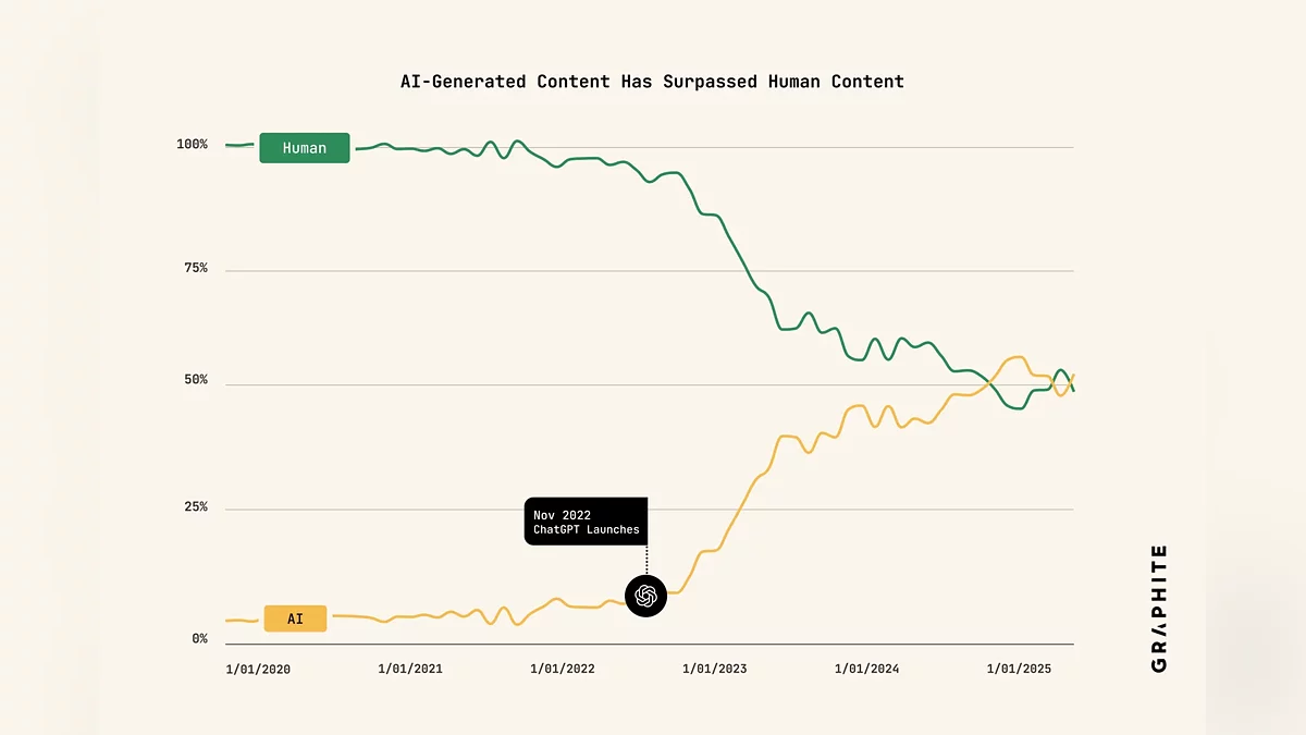 Так резкий скачок произошел после популяризации чат-ботов в конце 2022 года, а в начале 2025 года ИИ ненадолго вышел в лидеры, но сейчас доля материалов, созданных с помощью ИИ, стабилизировалась, составив чуть более половины всего контента.