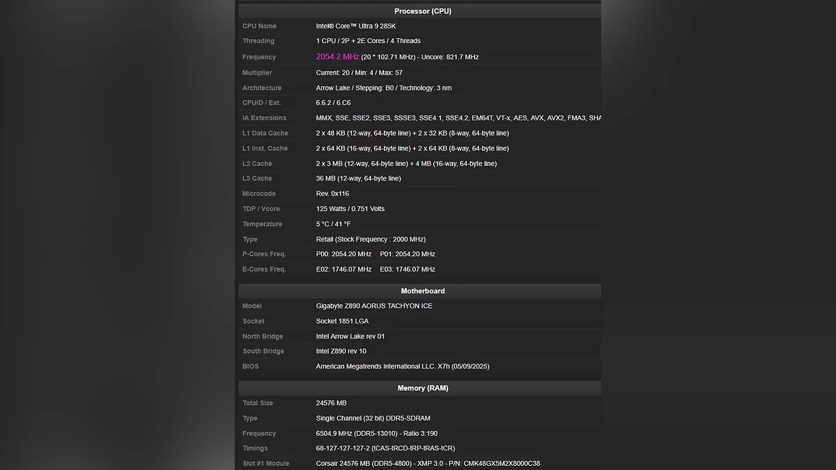 Для установления рекорда была собрана специализированная система, в основе которой лежит материнская плата GIGABYTE Z890 AORUS TACHYON ICE, предназначенная для экстремального разгона и процессор Intel Core Ultra 9 285K. Интересно, что для достижения максимальной скорости работы с памятью большинство ядер процессора были отключены и работали только 2 производительных и 2 энергоэффективных ядра из всех доступных.