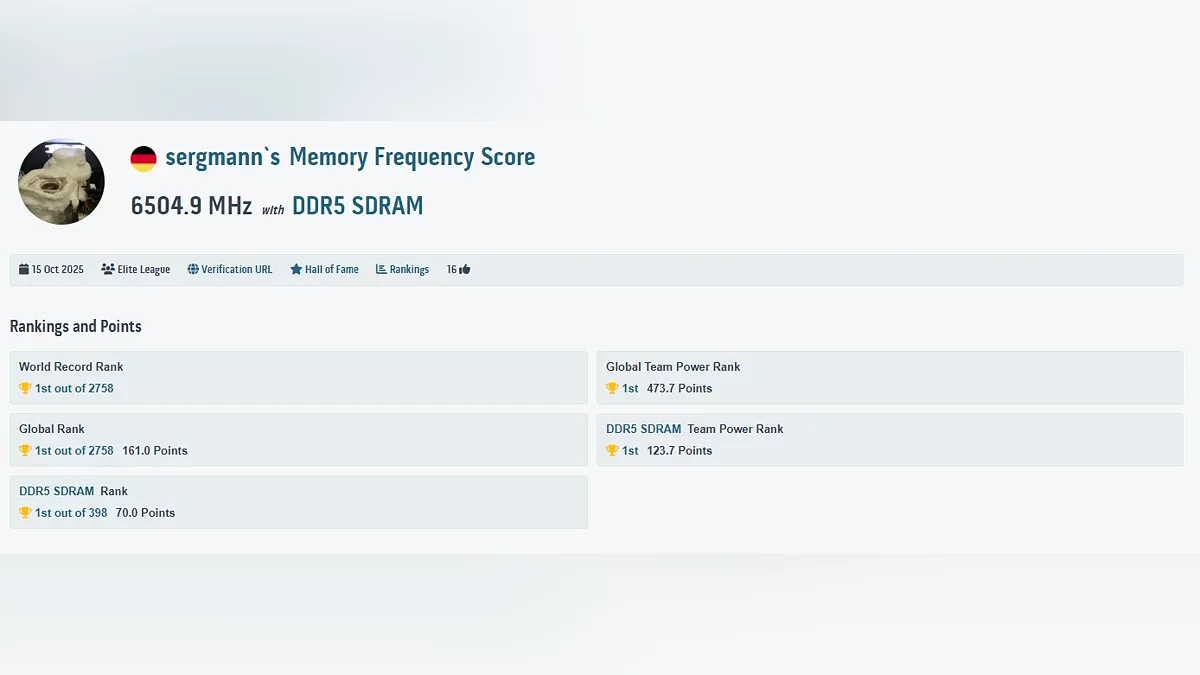 На платформе HWBOT был зафиксирован рекордный разгон оперативной памяти DDR5, так одному немецкому оверлокеру, под псевдонимом sergmann, удалось добиться стабильной работы памяти с частотой 13 010 МТ/с.