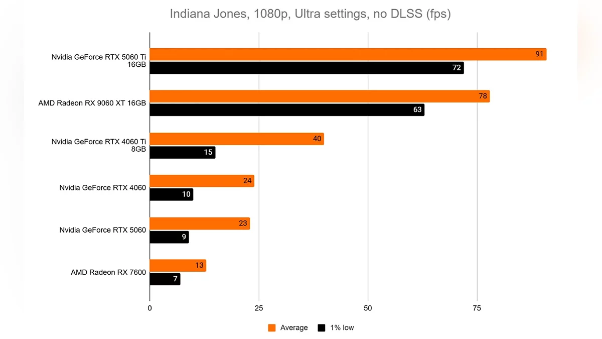 Причина такого ценового дисбаланса кроется в требованиях современных игр, ведь все больше и больше релизов начинают выходить за пределы 8 ГБ. Яркий пример Indiana Jones and the Great Circle, где разница в производительности между 8-гигабайтными и 16-гигабайтными моделями существенна. При этом показатели частоты кадров на картах с меньшим объемом памяти могут резко снижаться, что приводит к заметному замедлению работы.