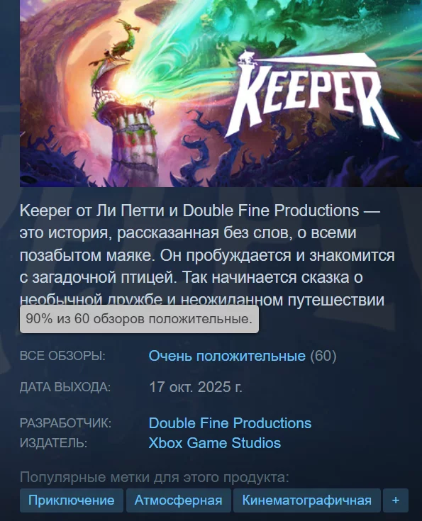 17 октября на PC и Xbox Series X/S состоялся релиз атмосферного приключения Keeper, созданного студией Double Fine Productions, известной по серии Psychonauts. Игра провалилась в Steam.