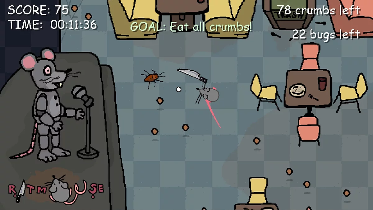 RATMOUSE — хардкорная аркадная 2D-игра, где игрокам, управляя крысой, нужно очистить созданные вручную локации от насекомых и полакомиться крошками. Страница в Steam.
