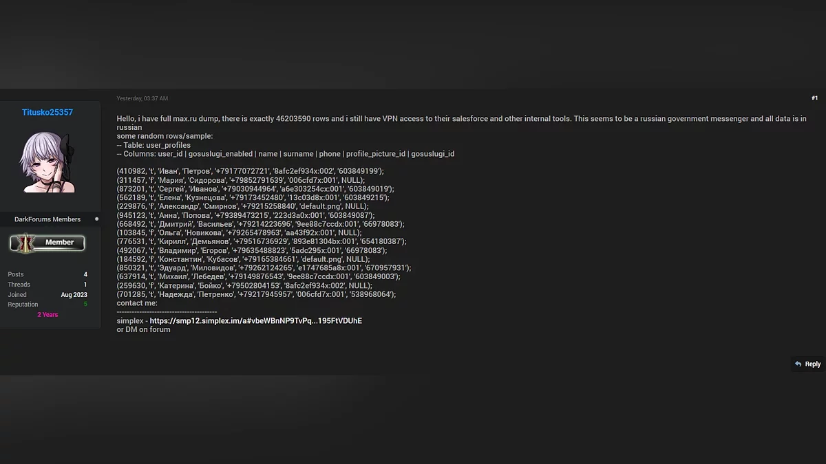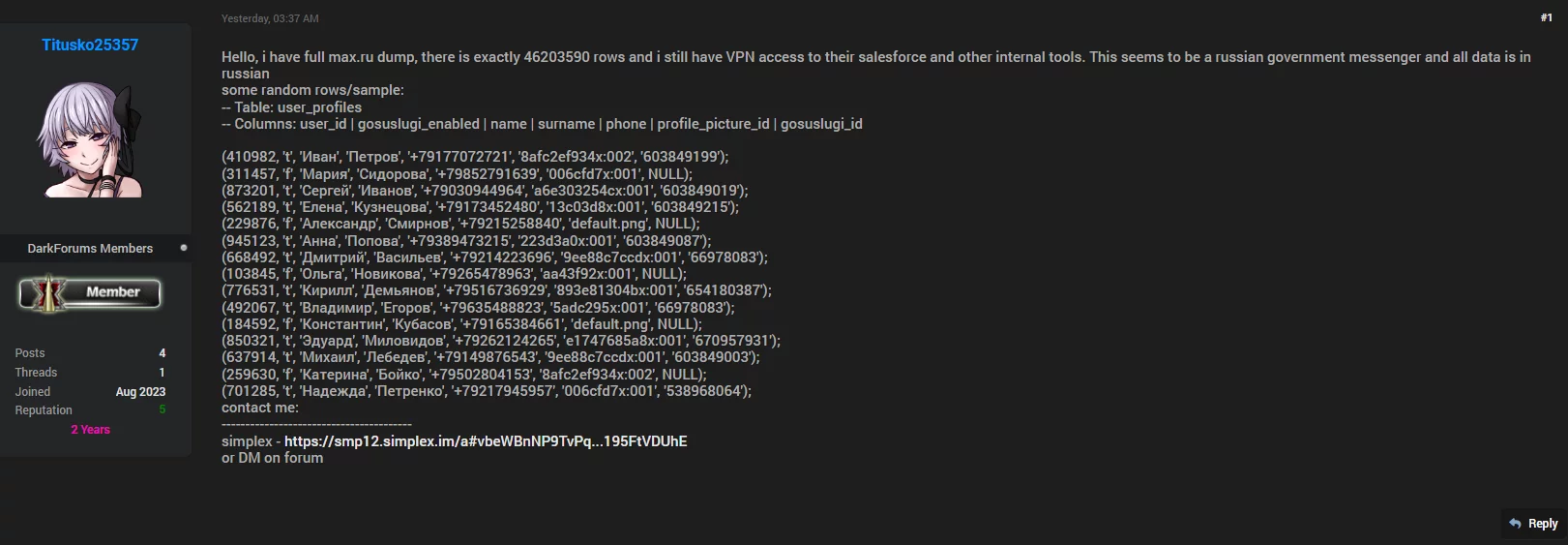На специализированном форуме DarkForums было размещено объявление о продаже базы данных российского мессенджера Max. Автор под ником Tutusko25357 заявил о доступе к информации 46 с лишним миллионов пользователей, включая номера телефонов и данные с портала «Госуслуги».