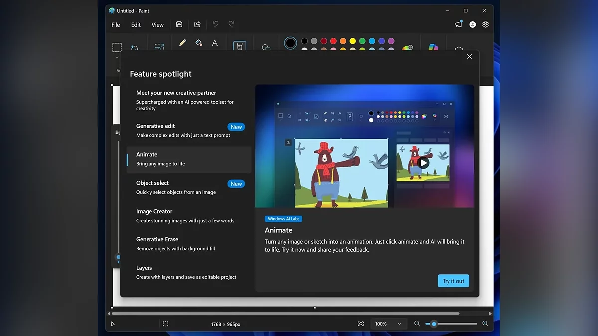 Похоже, что Paint в Windows 11 готовится к серьезному обновлению, так в рамках программы Windows AI Labs Microsoft начала тестировать для него две новые функции. Одна из них позволяет превратить любой статичный рисунок или загруженное изображение в короткую анимацию. Пользователям, получившим доступ к тестированию, для этого достаточно открыть файл в Paint и нажать одну кнопку, при этом создание анимации обходится без текстовых подсказок — искусственный интеллект самостоятельно анализирует картинку и решает, как её оживить.