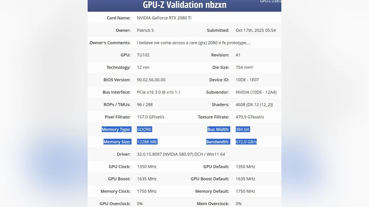 Проверка в GPU-Z показала, что перед владельцем не просто редкий экземпляр, но и более мощная версия устройства. В отличие от серийной модели с 11 ГБ памяти, прототип обладал 12 ГБ видеопамяти, увеличенной шиной и более высокой пропускной способностью. Все характеристики указывают на то, что инженеры NVIDIA изначально экспериментировали с различными конфигурациями чипа, прежде чем остановиться на финальном варианте.