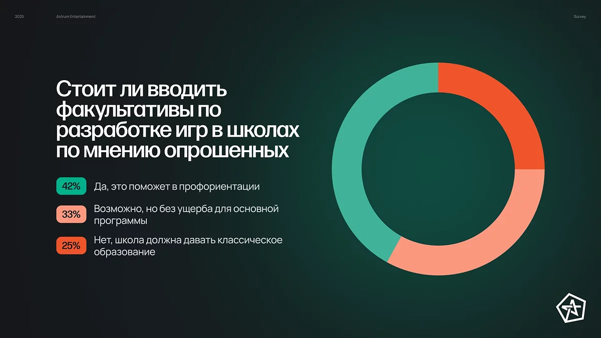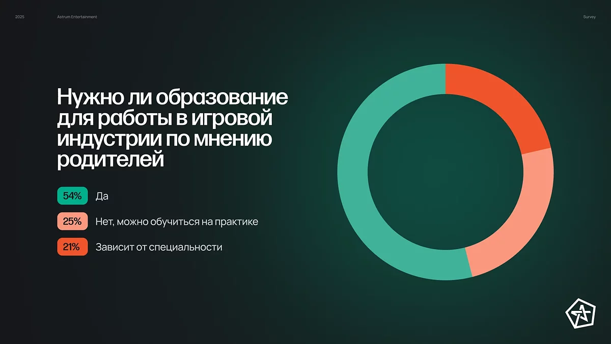 42% родителей считают, что в школах стоит ввести факультативы по разработке игр, а 71% уверены, что такие курсы помогут поступить в вуз и построить карьеру. Большинство (54%) уверены, что для работы в индустрии требуется профильное образование, однако 79% признались, что не знают о существующих программах по геймдеву в российских университетах.