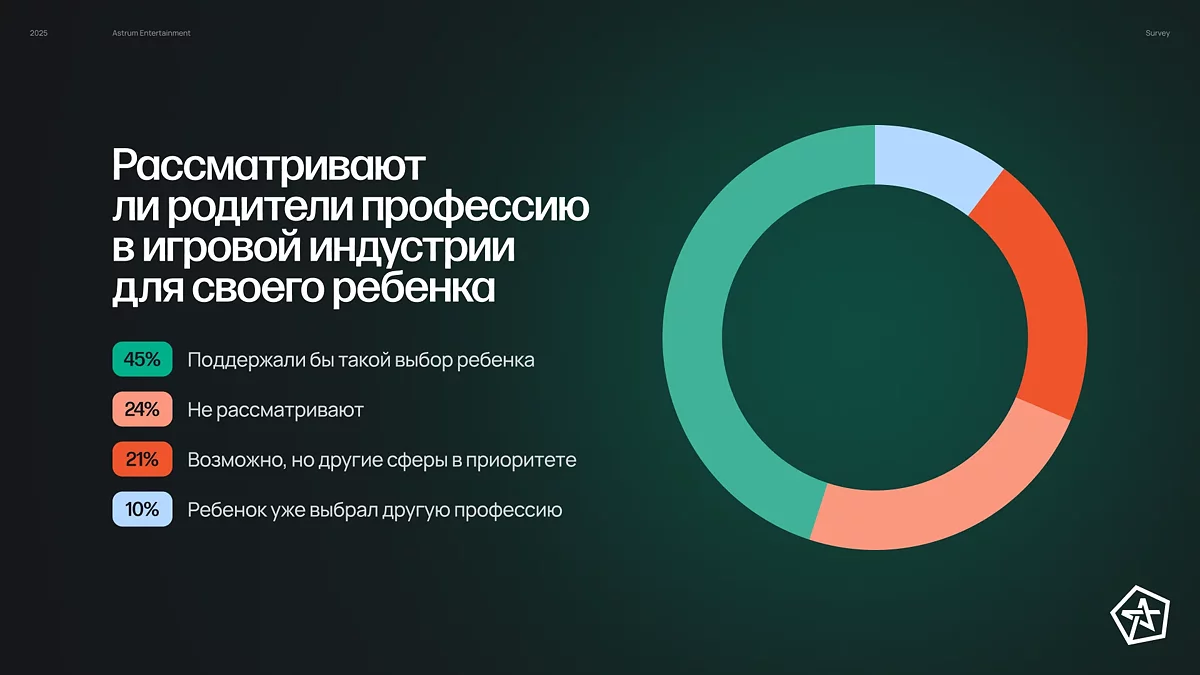 Компания Astrum Entertainment провела масштабный опрос среди 1500 родителей подростков, чтобы выяснить, как они воспринимают игровую индустрию в качестве карьерного пути. Результаты показали любопытное противоречие: большинство родителей уверены, что в геймдеве можно хорошо зарабатывать, но при этом редко говорят об этом с детьми.