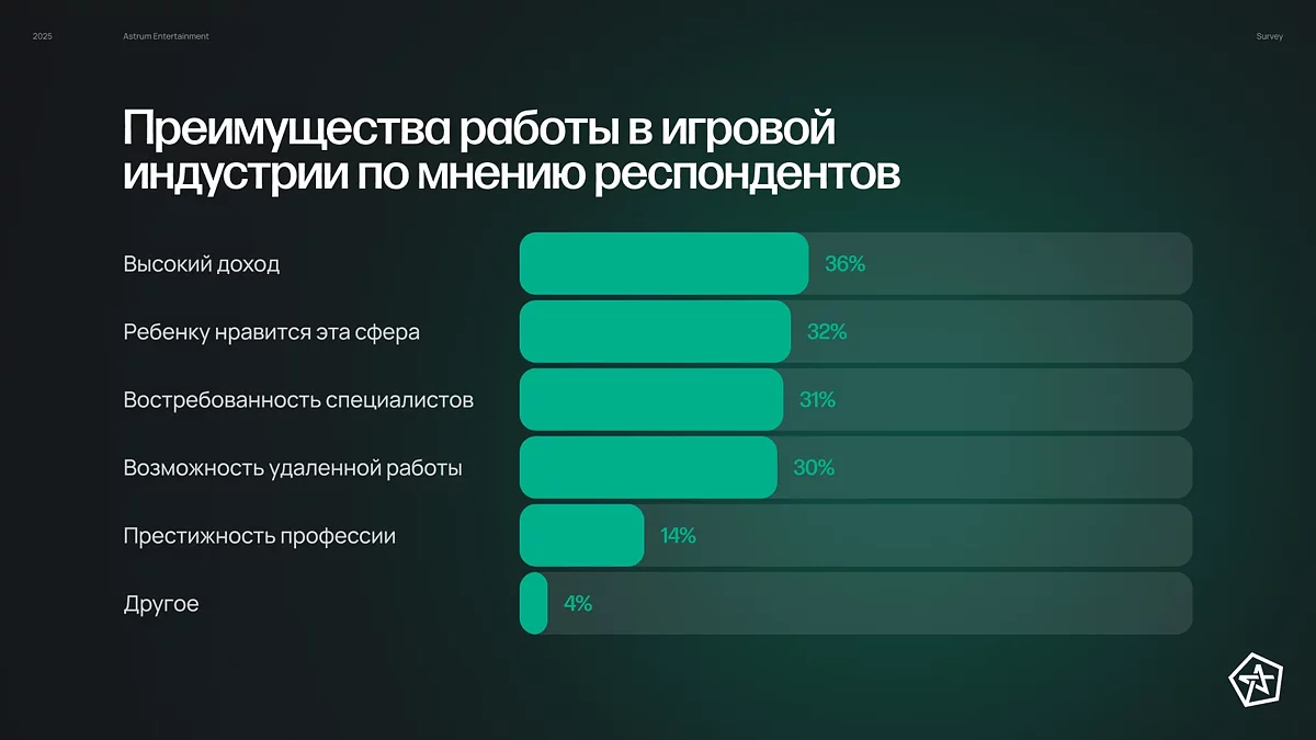 74% опрошенных считают, что в игровой индустрии можно зарабатывать не меньше, чем в банковском деле или промышленности. Почти половина родителей (45%) поддержали бы выбор ребёнка в пользу такой профессии. Однако 52% признались, что никогда не обсуждали карьеру в геймдеве с детьми. При этом каждый третий подросток заинтересован в работе в индустрии, а 17% уже посещали соответствующие курсы.