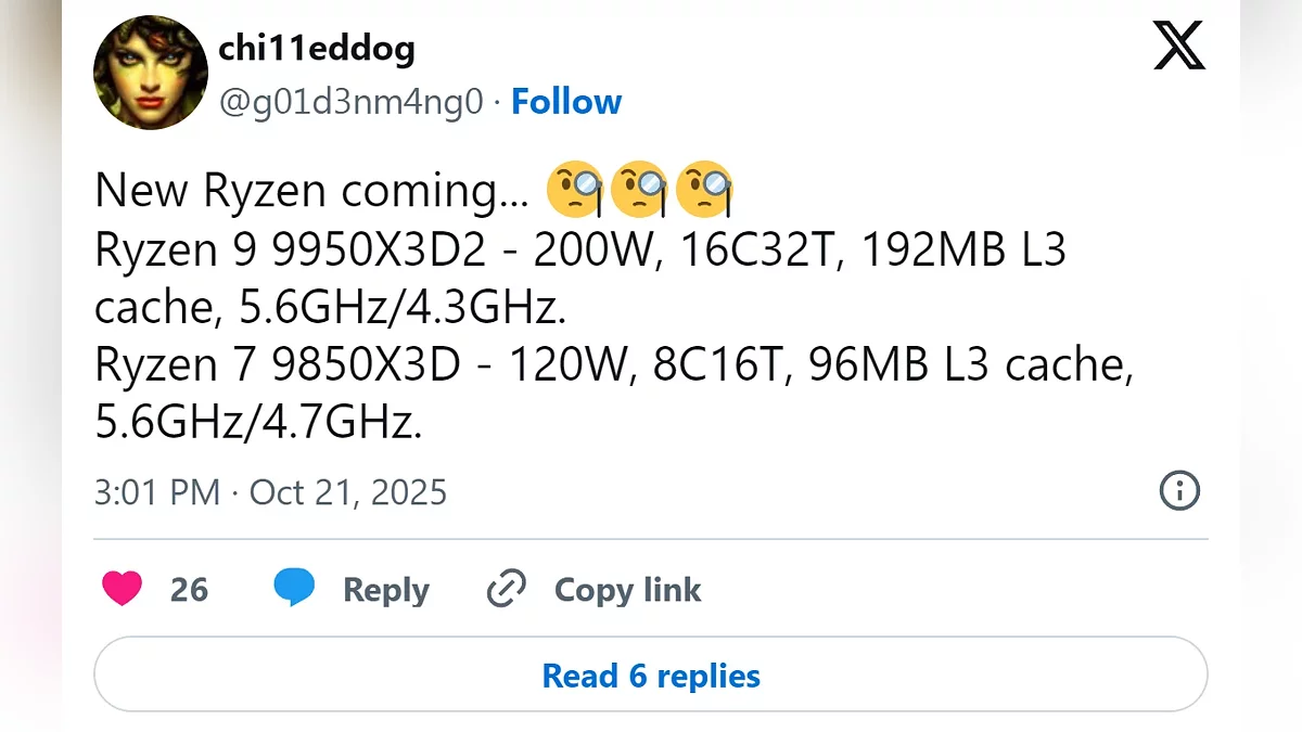 Особый интерес у геймеров может вызвать модель 9850X3D, которая, судя по спецификациям, устранит один из немногих недостатков предыдущего поколения — небольшое отставание по пиковой частоте от обычных версий. Точные сроки появления этих процессоров в продаже, как и их окончательная стоимость, пока остаются неизвестными, при этом официальных комментариев от AMD на этот счёт также пока не поступало.