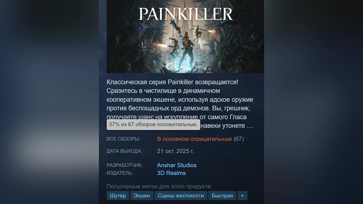 Спустя несколько часов после релиза кооперативного шутера от первого лица Painkiller начал получать первые отзывы в сервисе Steam. На момент публикации новости игра имеет 37% рейтинга.