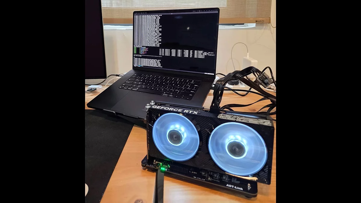 Стартап TinyCorp нашел способ объединить, казалось бы, несовместимые технологии, недавно специалисты компании разработали ПО, которое позволяет использовать графические ускорители NVIDIA серий RTX 3000, 4000 и 5000 вместе с ноутбуками Apple на базе процессоров серии M. При этом подключение осуществляется через стандартные док-станции с интерфейсом USB4 или Thunderbolt 4.
