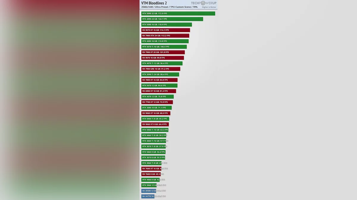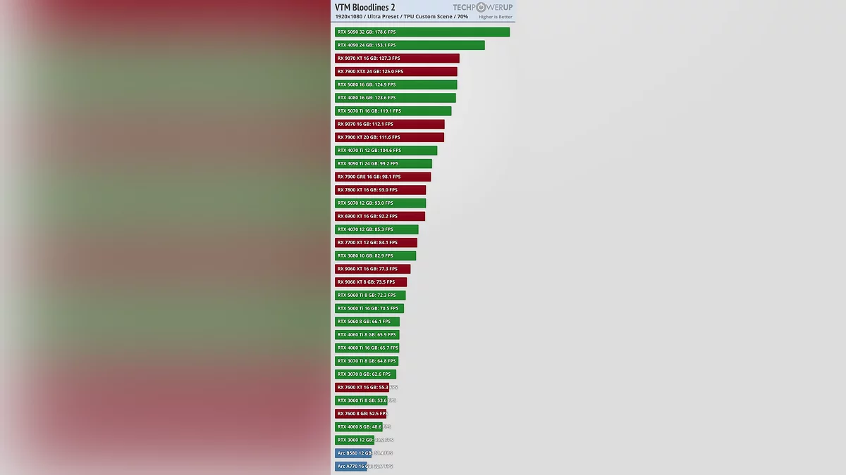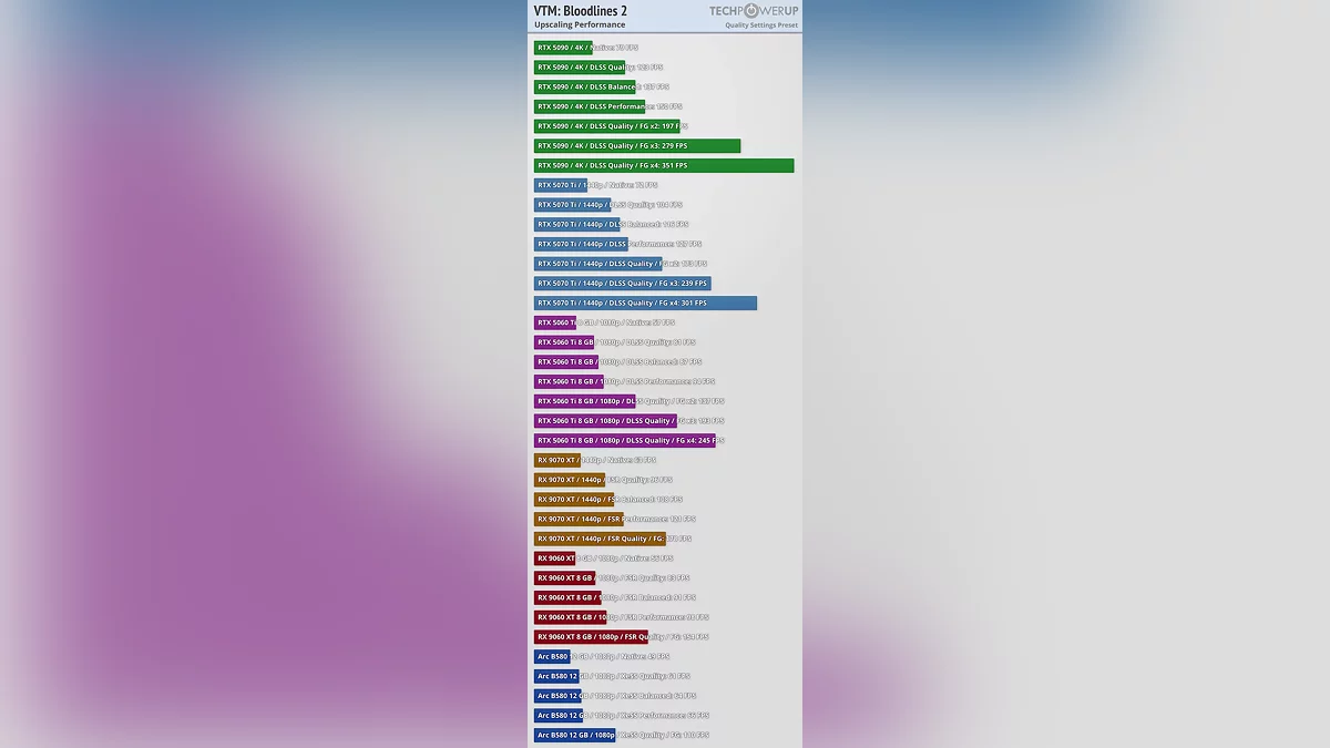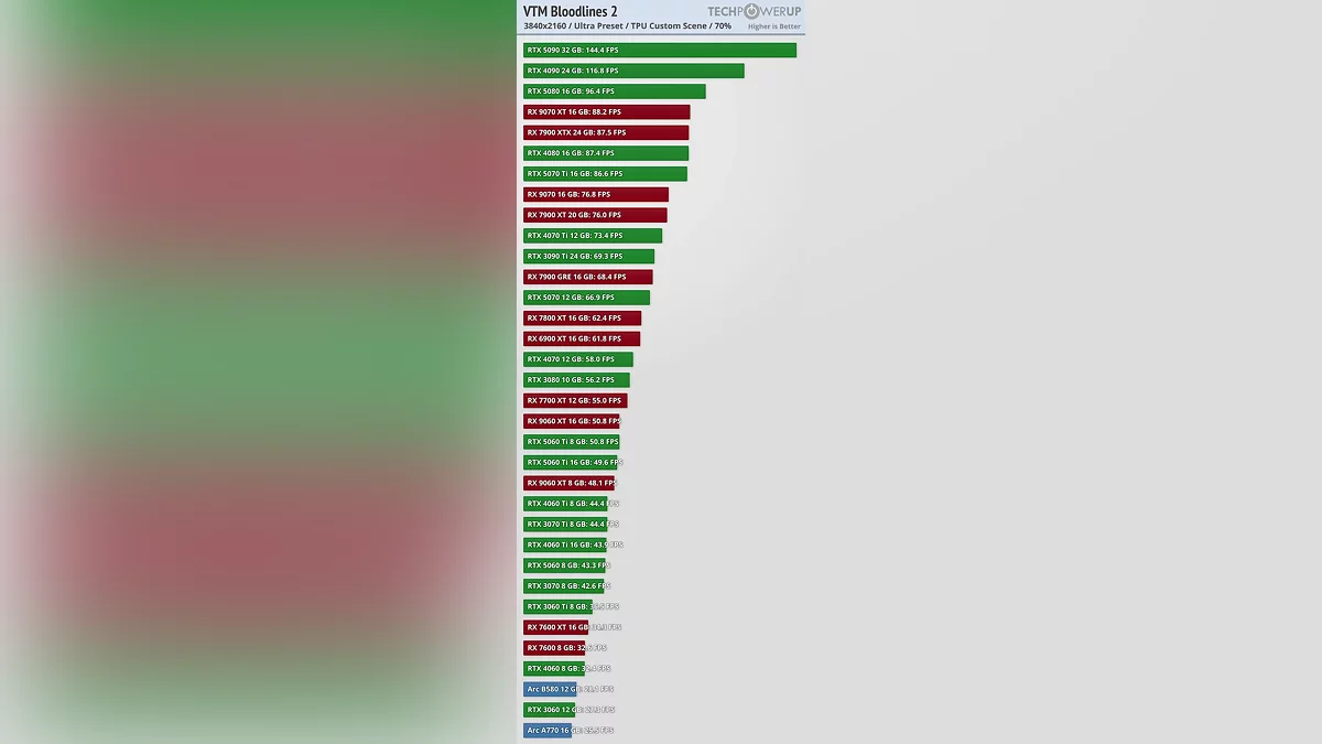 Требования к аппаратному обеспечению схожи с другими недавними играми на UE5 и неоправданно высоки для предлагаемой графики. К сожалению, я протестировал все 34 видеокарты с коэффициентом масштабирования 70% и обнаружил свою ошибку лишь по завершении работы. Ранее я упоминал о баге с коэффициентом масштабирования — суть в том, что игра сбрасывает его при каждом перезапуске. Изначально я думал, что он всегда будет устанавливаться на 70%, но, судя по показателям FPS, похоже, этот коэффициент зависит от разрешения рендеринга, в чем я не уверен. И я просто не могу позволить себе тратить столько времени на повторное тестирование всего. С таким автоматическим апскейлингом производительность не так уж плоха: RTX 5060, RTX 4060 Ti выдают более 60 FPS при 1080p, аналогичные результаты наблюдаются при 1440p, а 4K не сильно отстает, что, собственно, и наводит на мысль, что коэффициент масштабирования не является постоянным.
