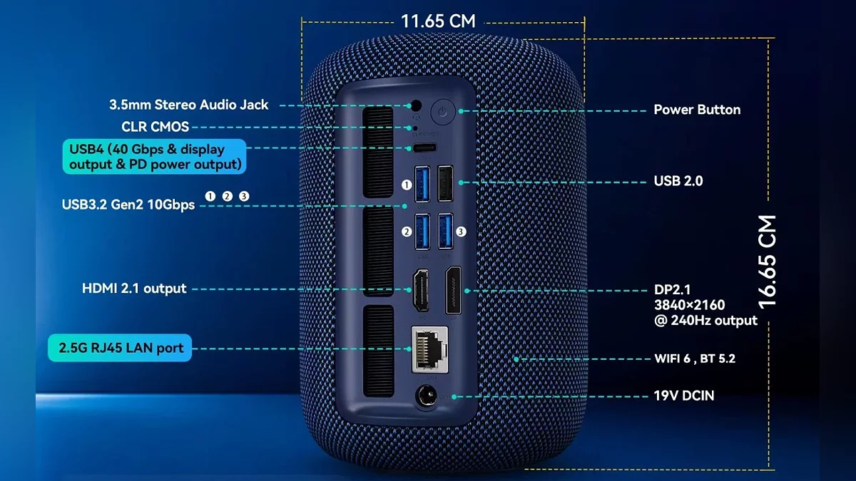 Коммуникационные возможности мини-ПК включают поддержку Wi-Fi 6 и Bluetooth 5.0, а на тыльной панели расположен богатый набор портов: высокоскоростной USB4 Type-C, три порта USB 3.2, HDMI 2.1, DisplayPort 2.0 и разъем для сетевого кабеля 2.5G Ethernet. Верхняя панель устройства содержит световой элемент с настраиваемой подсветкой, которую при желании можно отключить. Система активного охлаждения скрыта за вентиляционными решетками на задней и нижней части корпуса.