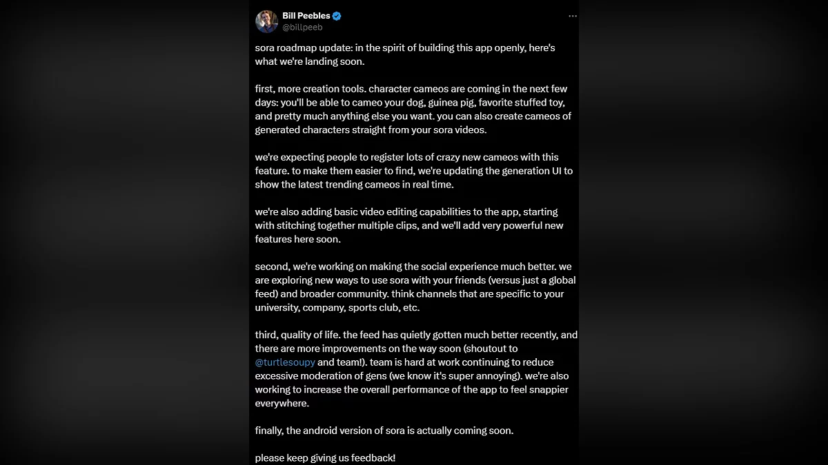 Также команда продолжает работу над стабильностью и скоростью работы Sora. Пользователи уже могли заметить, что лента рекомендаций стала умнее, а система модерации реже блокирует контент без веской причины. Ожидается, что эти улучшения сделают использование сервиса еще более комфортным. Изменения затронут и социальную составляющую сервиса, в планах — создание узкоспециализированных сообществ.