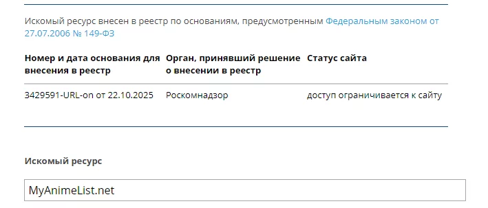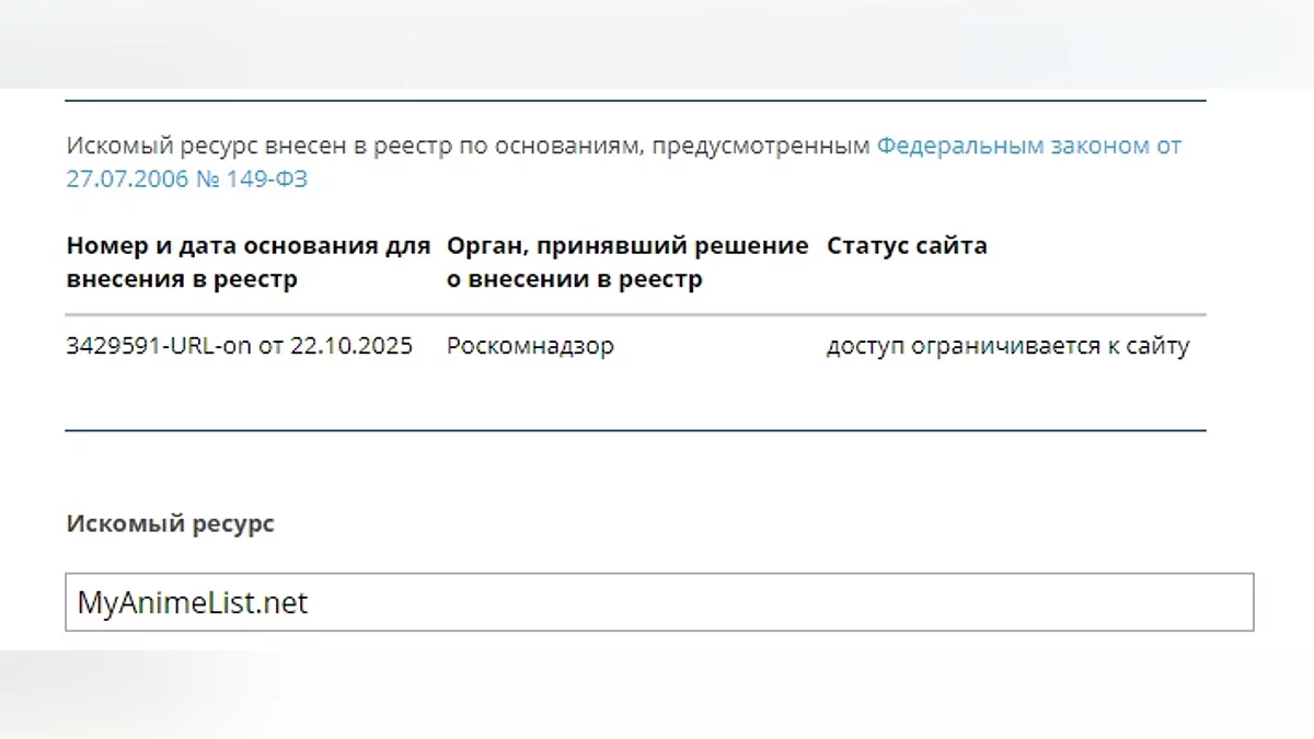 Российские поклонники аниме столкнулись с очередной потерей, пользователи из РФ потеряли возможность заходить на популярный международный сайт MyAnimeList.net. Ресурс, представляющий собой обширный каталог японской анимации и комиксов, был внесен в единый реестр запрещенной информации.