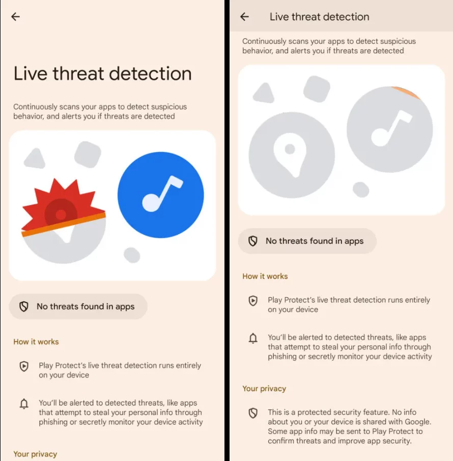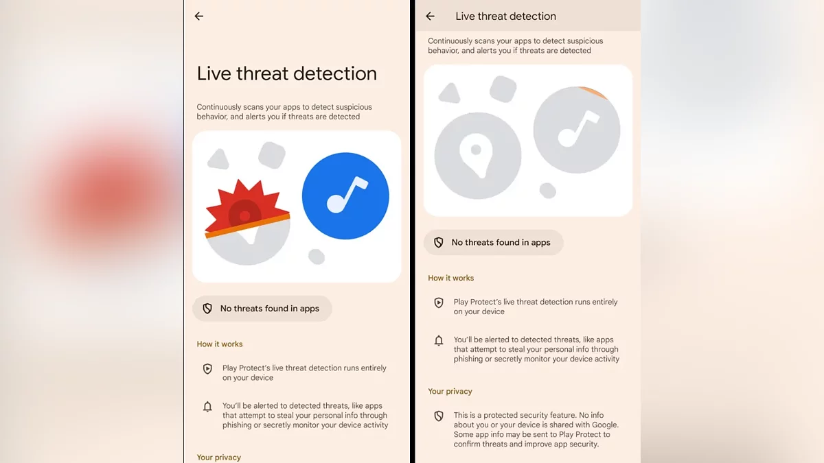 Функция Live Threat Detection, которая использует искусственный интеллект для выявления опасного софта прямо на устройстве, появилась в прошлом году. Сейчас функция работает в фоновом режиме, показывая уведомление только в момент обнаружения проблемы, однако обновление должно вывести защиту на новый уровень информированности пользователя. Согласно данным из Google Play Protect, для системы безопасности готовится отдельный интерфейс, где можно будет увидеть полный список программ, которые были классифицированы как небезопасные, что позволит анализировать угрозы и их историю.