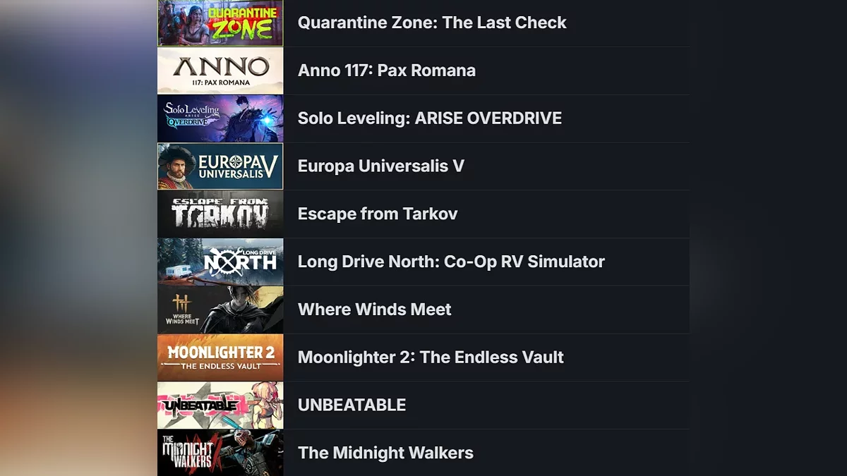 В ТОП-10 не смогли попасть Call of Duty: Black Ops 7 (11 место), Of Ash and Steel (12 место), Football Manager 26 (16 место), Sonic Rumble (19 место), City Car Driving 2.0 (24 место), Assetto Corsa Rally (31 место), Terminator 2D: NO FATE (33 место), SpongeBob SquarePants: Titans of the Tide (39 место), Sacred 2 Remaster (42 место), Surviving Mars: Relaunched (43 место) и Syberia — Remastered (47 место).