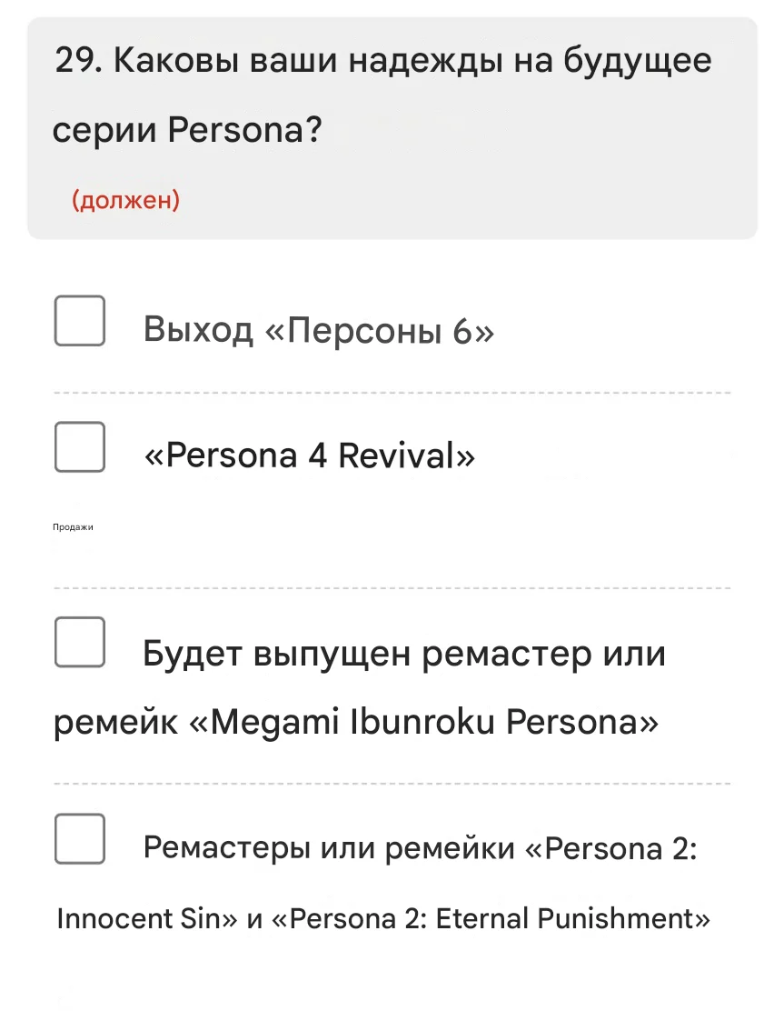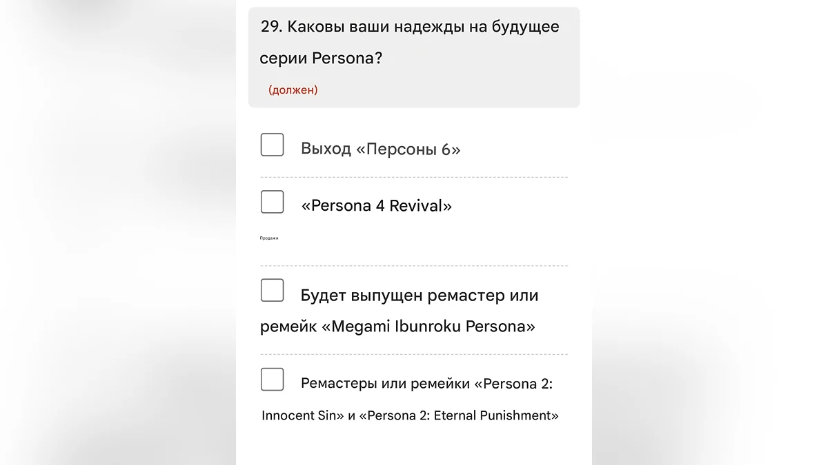 Вопрос номер 29 спрашивает, какие будущие проекты серии интересуют игроков больше всего. В списке — Persona 6, ремейк Persona 4 Revival и обновлённые версии первых двух частей. Формулировка вопроса не гарантирует, что все перечисленные игры точно выйдут — скорее, Atlus выясняет, что фанаты хотят увидеть в будущем. Persona 4 Revival уже анонсирована, Persona 6 подтверждена — под вопросом только ремейки первых двух игр.