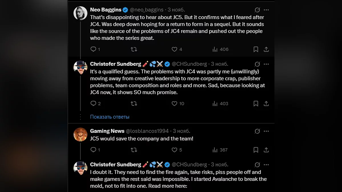 Кристофер Сундберг (Christofer Sundberg), создатель франшизы Just Cause и основатель Avalanche Studios, наконец-то прокомментировал будущее популярной серии, заявив, что Just Cause 5 никогда не выйдет. По его словам, даже если бы разработка продолжения и началась, это не спасло бы студию, поскольку проблемы с четвёртой частью оказались слишком серьёзными.
