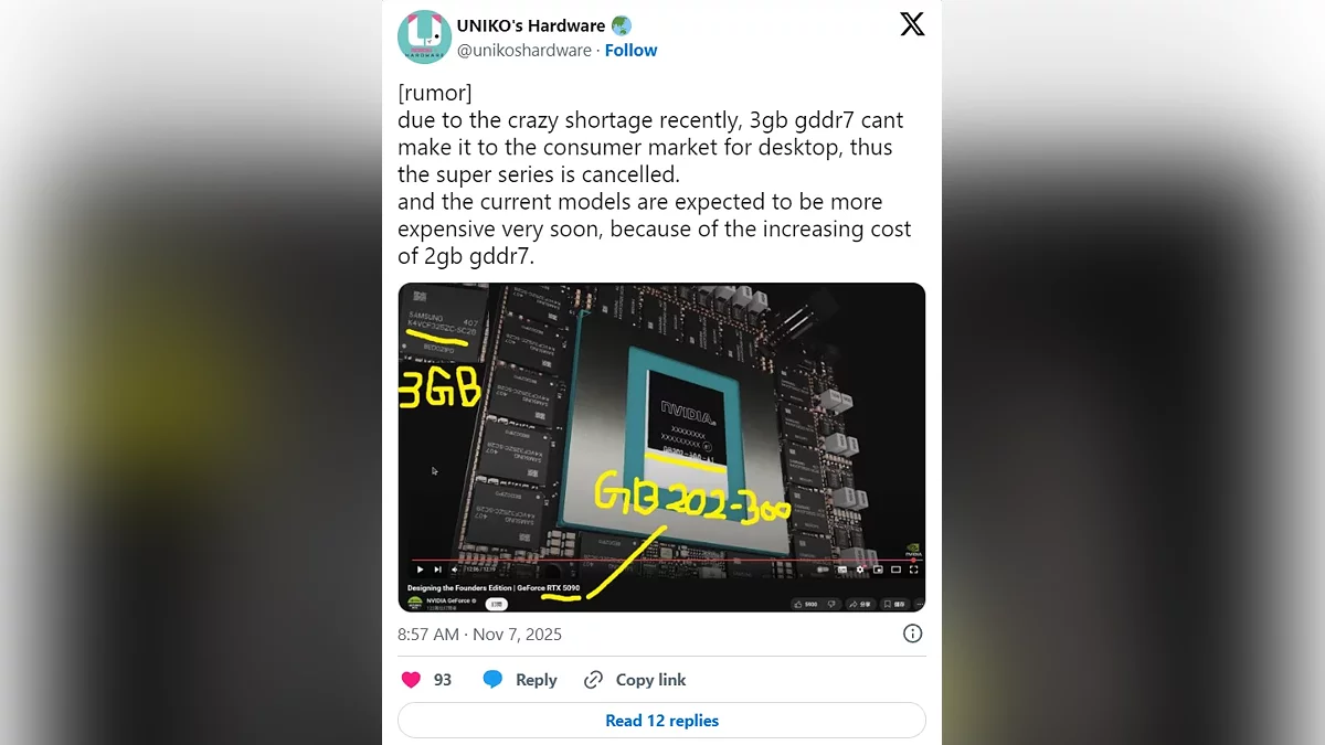 Изначально считалось, что именно эти чипы памяти станут ключевым улучшением для грядущих моделей RTX 5080 SUPER, RTX 5070 Ti SUPER и RTX 5070 SUPER. Они позволили бы значительно увеличить видеопамять без изменения шины: до 24 ГБ для старших моделей и до 18 ГБ для младшей, однако, как выяснилось, доступные запасы 3ГБ GDDR7 теперь направят на другие продукты — например, на мобильную RTX 5090 для ноутбуков и профессиональные модели RTX PRO 6000 Blackwell, где прибыль выше.