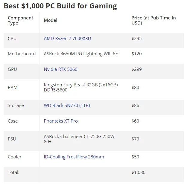 Бюджет в тысячу долларов открывает двери в мир качественного гейминга в разрешении 1440p. Здесь эксперты Tom's Hardware советуют переходить на платформу AMD. Процессор Ryzen 7 7600X3D с его огромным кэшем показывает феноменальные результаты в играх. В пару к нему предлагается видеокарта NVIDIA RTX 5060, а также 32 ГБ памяти DDR5. При этом системе не требуется мощная СЖО и достаточно не самого дорогого воздушного кулера. Общая стоимость сборки оценивается в $1 080 (около 88 000 рублей).