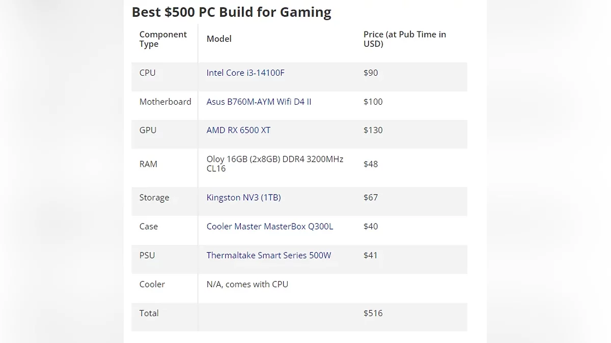 Для старта в PC-гейминге не нужны большие вложения и даже за $500 (около 41 000 рублей) можно собрать систему с дискретной видеокартой, которая потянет многие современные игры в разрешении 1080p на средних настройках. Основу такой сборки составляет процессор Intel Core i3-14100F, в паре с материнская платой ASUS B760M-AYW WIFI D4 и 16 ГБ недорогой оперативной памяти DDR4. За графику отвечает видеокарта AMD Radeon RX 6500 XT, чего вполне достаточно для комфортной игры в большинство проектов, пусть и не на ультра-настройках.