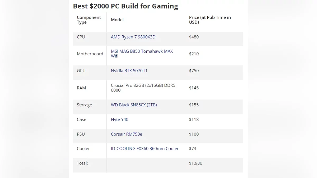 Сборки от $1 500 предназначены для тех, кто не готов к компромиссам. Связка процессора AMD Ryzen 7 7800X3D или Ryzen 7 9800X3D с видеокартой RTX 5070 Ti с 16 ГБ памяти позволяет наслаждаться игрой в 4К с максимальным уровнем детализации и включенной трассировкой лучей. при этом система имеет 32 ГБ ОЗУ и SSD на 2 ТБ. Такая сборка обойдется в $1 980 (около 161 000 рублей).