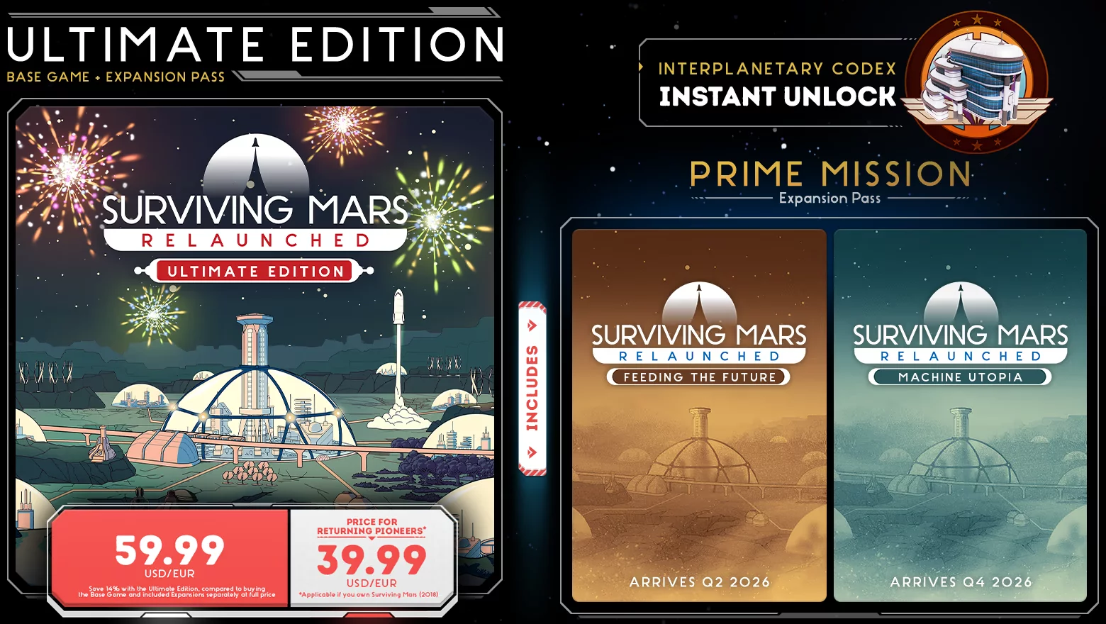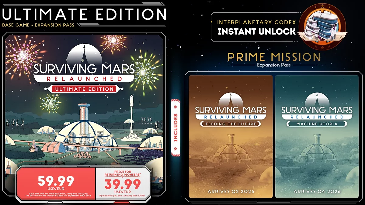 В 2026 году Surviving Mars: Relaunched получит два крупных платных дополнения — Feeding the Future и Machine Utopia. Первое DLC выйдет во втором квартале и расширит системы производства продуктов питания, добавив новые механики, ингредиенты и блюда. Второе дополнение станет доступно в четвёртом квартале и позволит заменить человеческий труд мощными машинами.