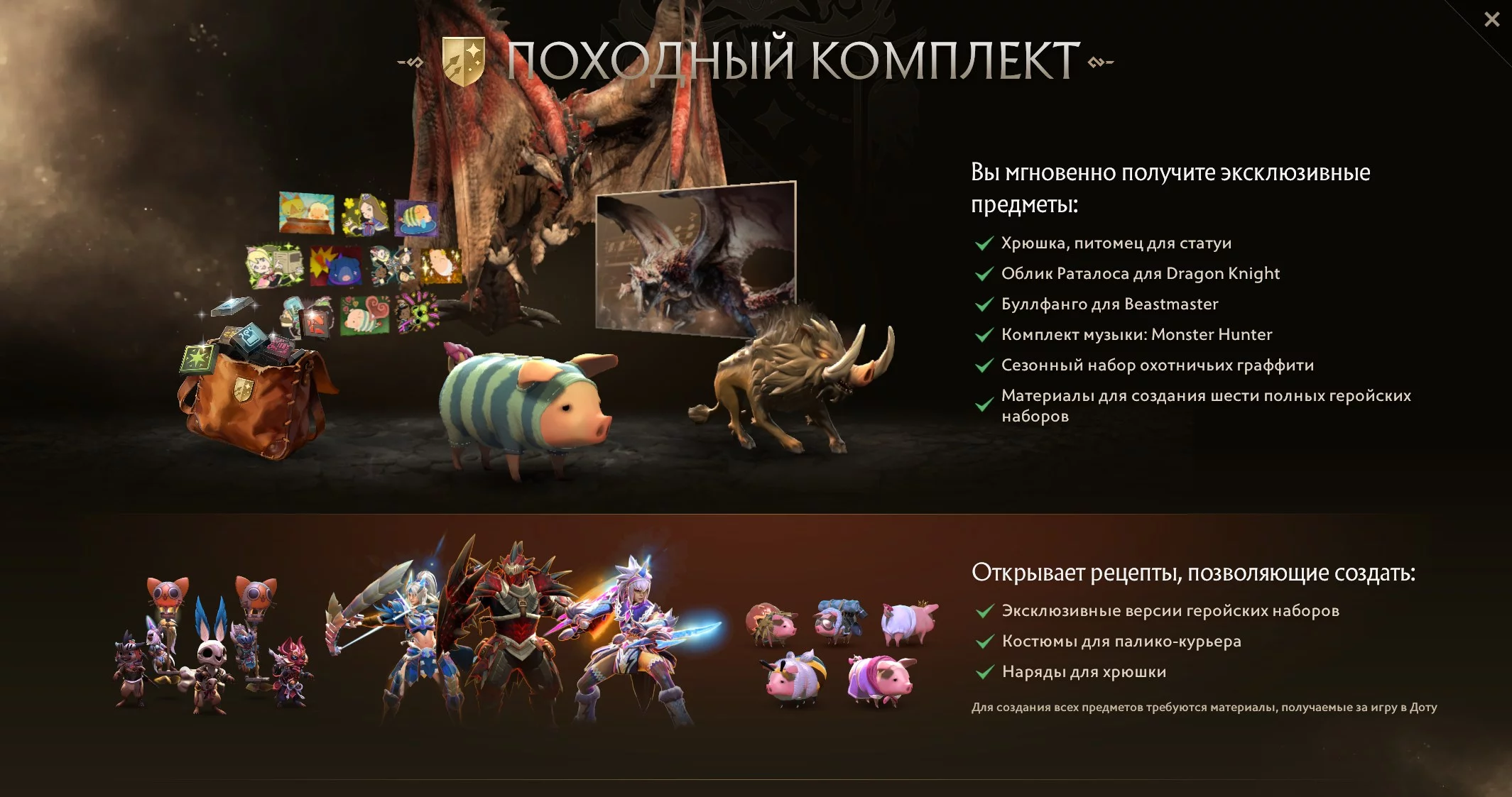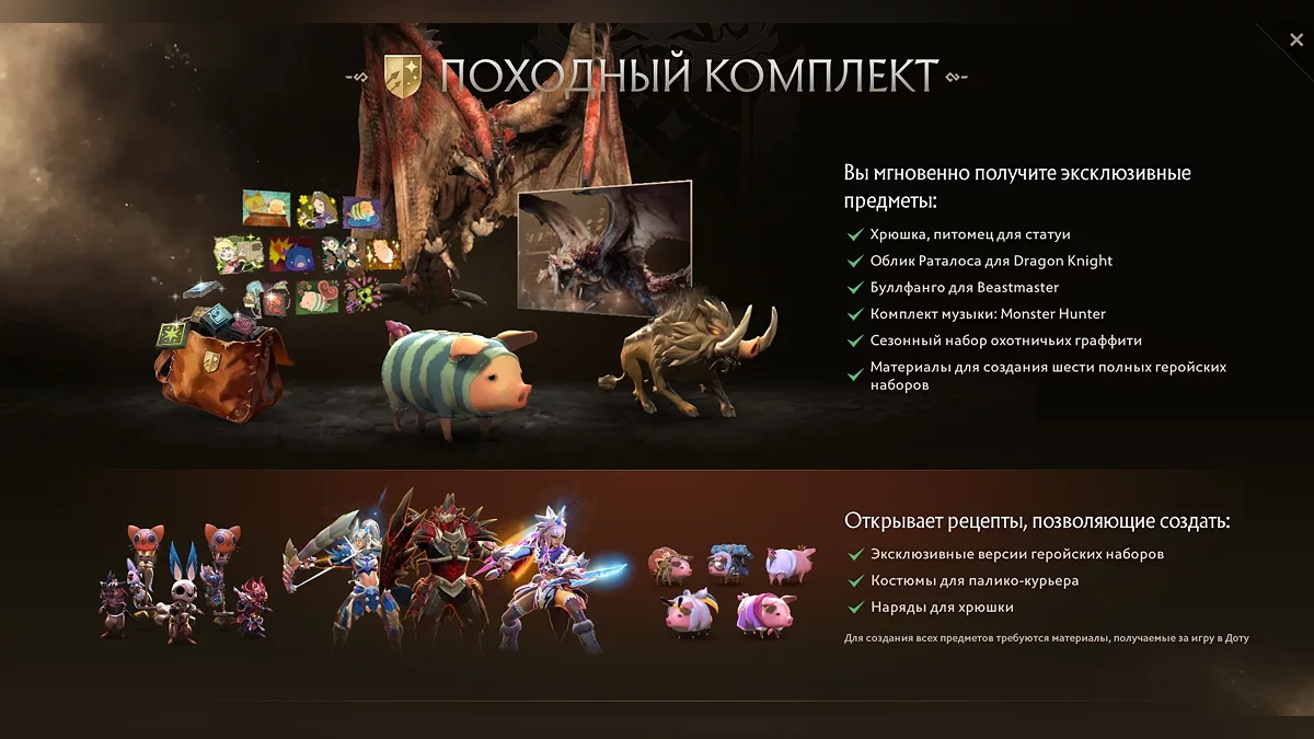 Открылся сезон охоты на самых опасных героев в мире, и выследить их предстоит именно вам! Мы рады объявить о масштабном кроссовере Доты с Monster Hunter: вас ждут новые наборы, питомцы, система охоты и создания предметов — и, разумеется, монстры. (Если вас приводило в восторг то, как Dragon Knight становится драконом, но гораздо больше восторга вызвало бы превращение в легендарного раталоса, спешим порадовать: мы и Capcom с удовольствием воплотили эту идею в жизнь.)