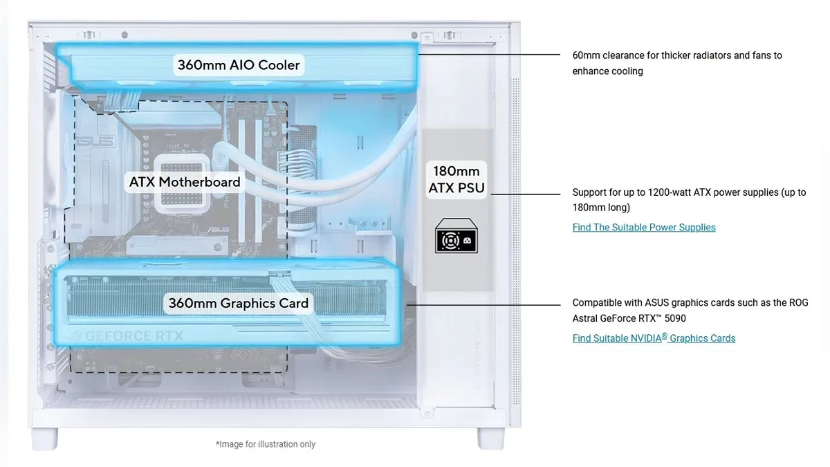 Для систем жидкостного охлаждения предусмотрено место под 360-миллиметровый радиатор в верхней части корпуса, а дополнительные вентиляторы можно разместить в нижней секции. Ширина отсека для прокладки кабелей составляет 34 мм, что помогает аккуратно организовать провода и улучшить циркуляцию воздуха.