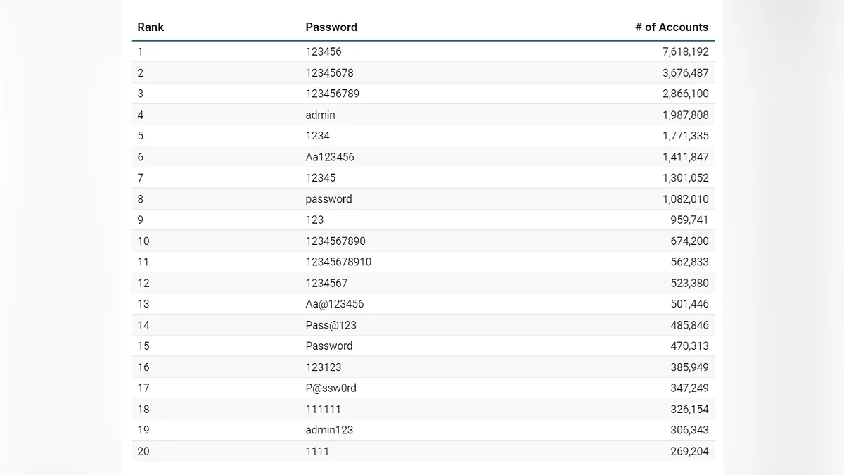 Специалисты, изучившие информацию с хакерских форумов, констатируют: самые распространенные комбинации для защиты учетных записей остаются примитивными, а лидером антирейтинга вновь стала последовательность «123456», которую использовали миллионы раз. В десятку худших также стабильно входят «password», «admin» и другие простые наборы цифр и букв.