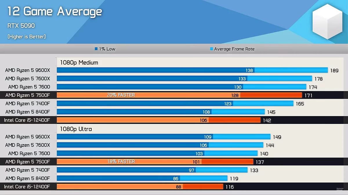 Сравнительный анализ двух популярных процессоров для недорогих игровых систем показал ощутимую разницу в производительности. Несмотря на то, что оба чипа позиционируются как бюджетные решения, один из них демонстрирует заметно более высокую частоту кадров в большинстве современных проектов. Авторы Hardware Unboxed протестировали шестиядерные AMD Ryzen 5 7500F и Intel Core i5-12400F в двенадцати актуальных играх, а для чистоты эксперимента использовалась мощная видеокарта и быстрая оперативная память, чтобы минимизировать влияние других компонентов на результат.