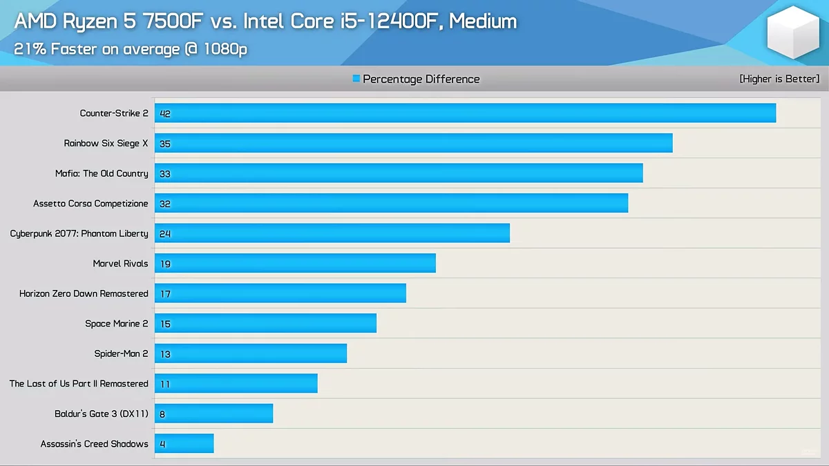 Наибольшее преимущество Ryzen 5 7500F было зафиксировано в Counter-Strike 2 и Rainbow Six Siege, где разрыв достиг 30-42%. Существенный отрыв был также зафиксирован в гоночном симуляторе Assetto Corsa Competizione и игре Mafia: The Old Country. В то же время, в некоторых проектах, сильно зависящих от видеокарты, например, в Assassin's Creed Shadows, разница между процессорами была минимальной.
