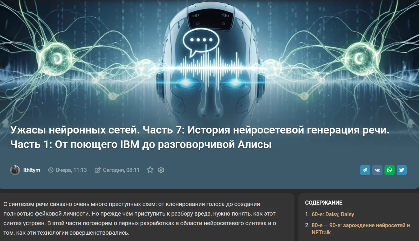 Пришло время подвести итоги и объявить победителя! Им стал пользователь с ником ithitym со статьёй «Ужасы нейронных сетей. Часть 7: История нейросетевой генерация речи. Часть 1: От поющего IBM до разговорчивой Алисы». Этот материал отличился информативностью, грамотной подачей и глубоким раскрытием темы. Особенно примечательно, что это часть большого цикла статей, и мы не смогли обойти вниманием столь масштабный и последовательный труд.