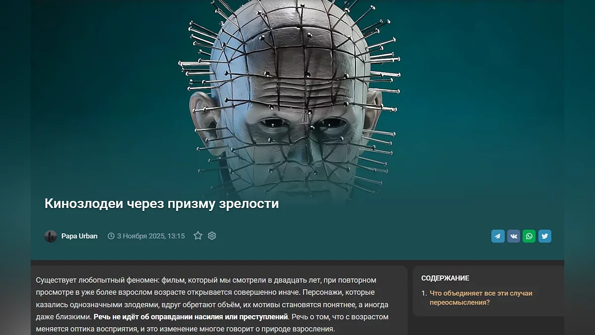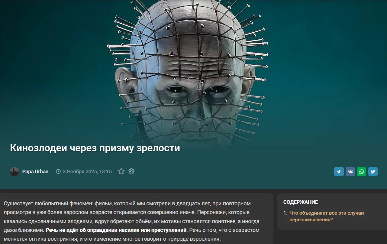 А еще на этот раз у нас есть серебряный призер — пользователь с ником Papa Urban со статьей «Кинозлодеи через призму зрелости».