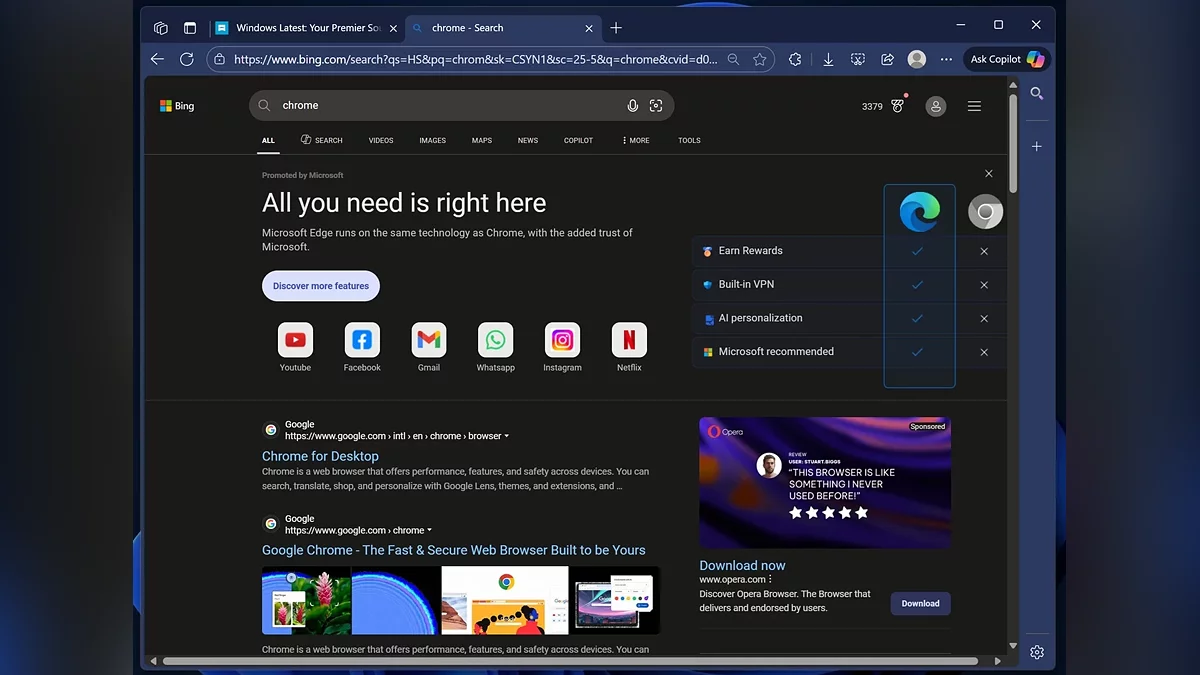 Microsoft стала начислять баллы пользователям Windows 11 за отказ от загрузки Chrome