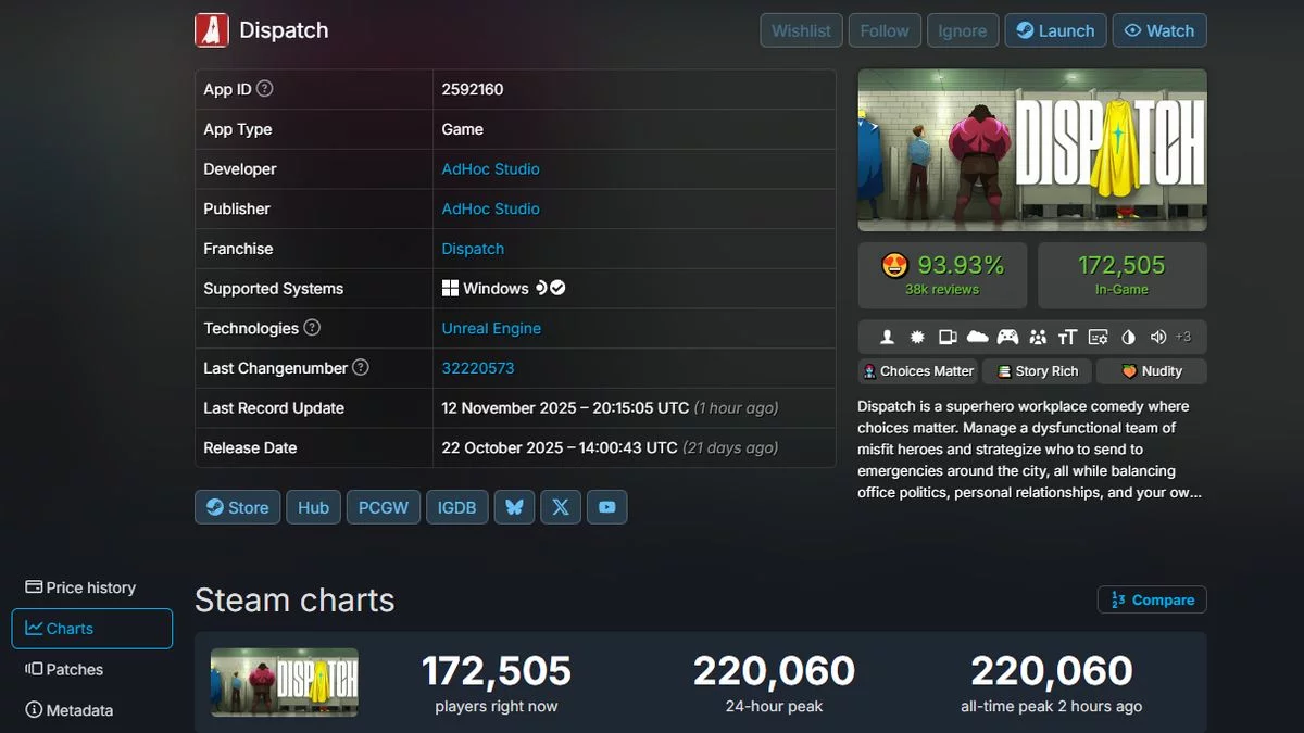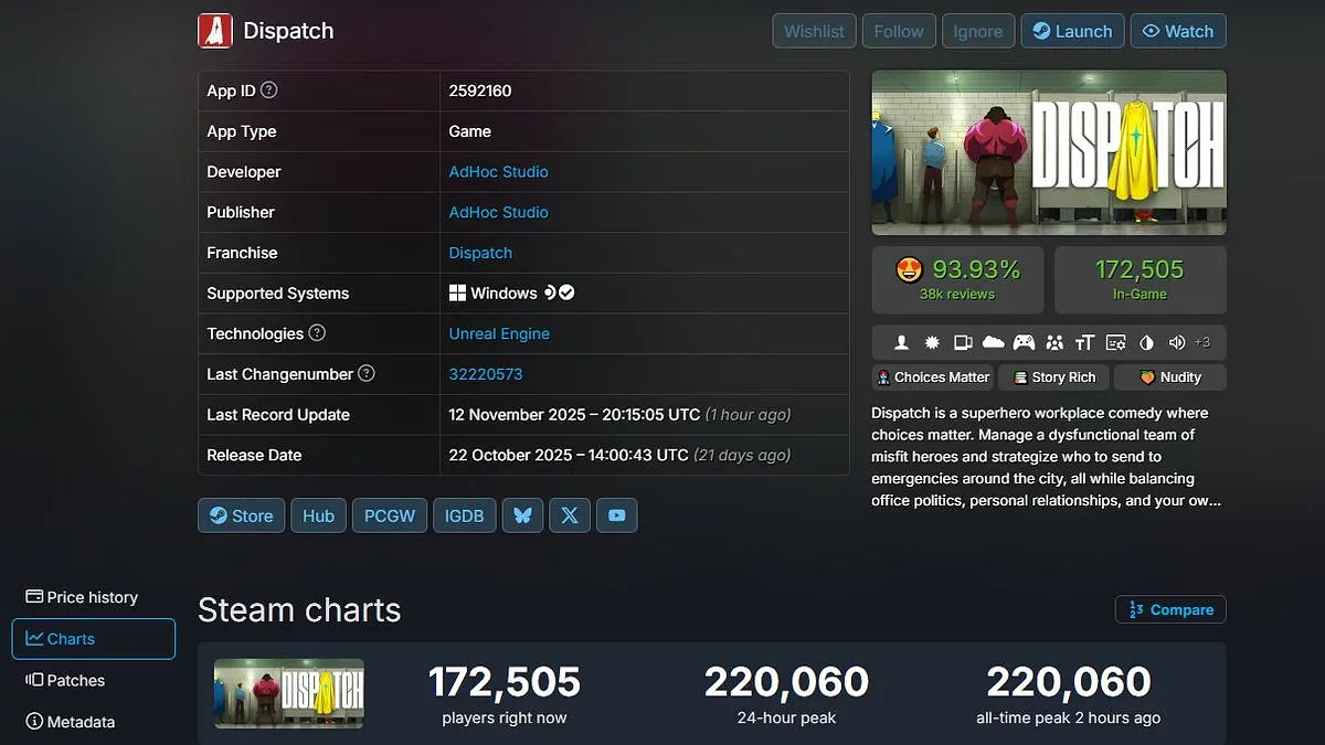 Создатели игры Dispatch из студии AdHoc Studio рассказали, что проект почти достиг целевого показателя продаж, рассчитанного на три года, всего за три месяца. По их словам, игра уже превысила отметку в миллион проданных копий, а интерес к ней растёт благодаря еженедельному выпуску эпизодов.