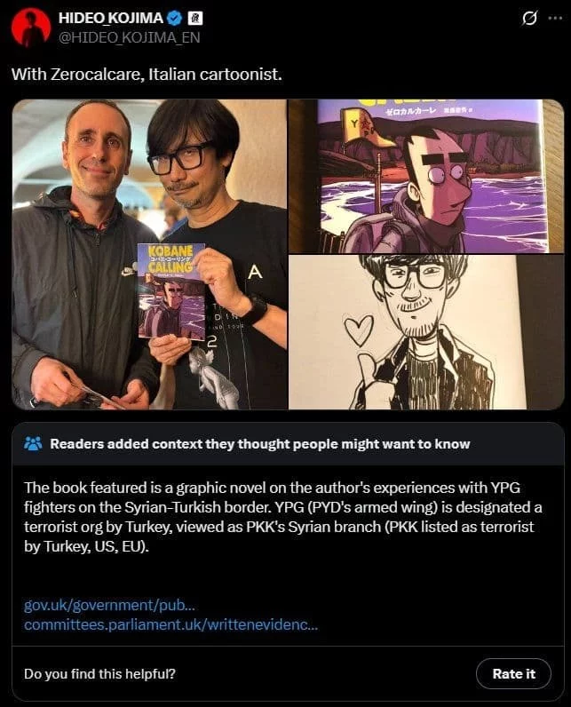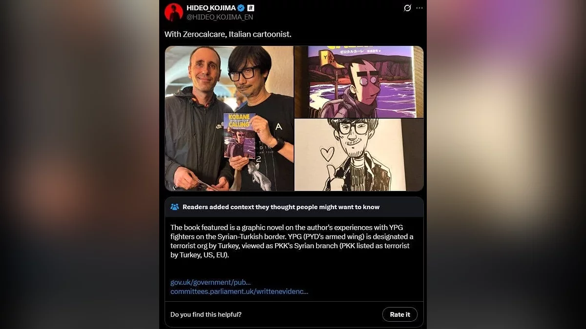 Знаменитый японский геймдизайнер Хидео Кодзима (Hideo Kojima) оказался в центре скандала после того, как опубликовал и вскоре удалил фото с итальянским карикатуристом Микеле «Zerocalcare» Реком (Michele Rech) на фестивале Lucca Comics & Games 2025. На снимке Кодзима держал в руках графический роман Kobane Calling, посвящённый конфликту в Сирии и курдскому ополчению YPG — группе, которую Турция считает террористической из-за её связей с Рабочей партией Курдистана (РПК), тогда как США считают её союзником в борьбе против ИГИЛ.