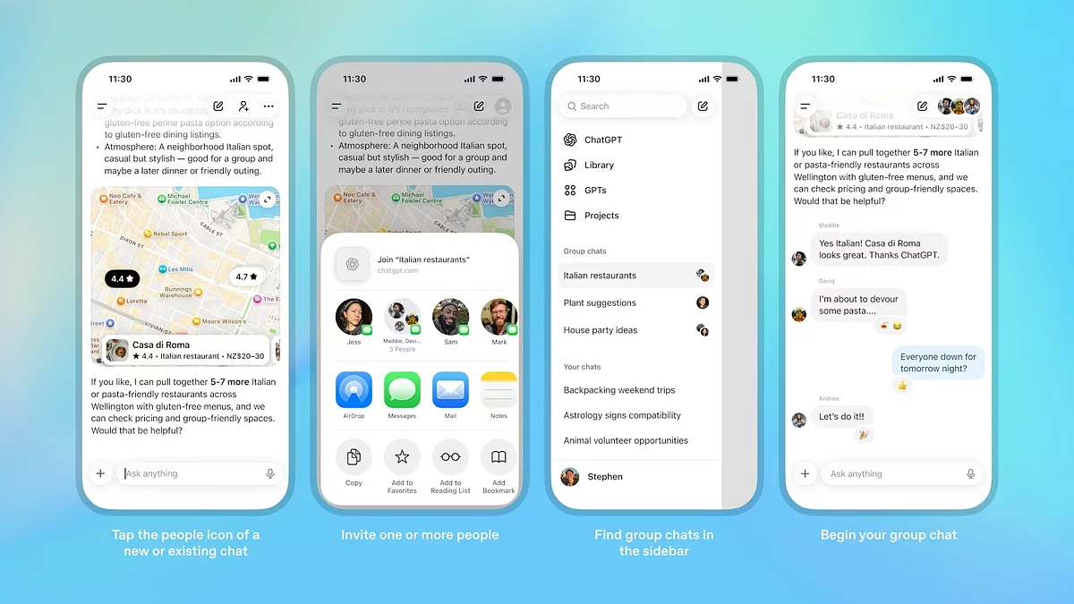 Компания OpenAI начала ограниченное тестирование новой функции — групповых чатов в ChatGPT. Сейчас возможность создать общий диалог с участием искусственного интеллекта и нескольких людей доступна ограничено. Идея нововведения — превратить чат-бота в участника коллективных обсуждений. Нейросеть может помочь компании друзей выбрать маршрут для путешествия, коллегам — сформировать структуру отчета, а семье — согласовать дизайн будущего ремонта.