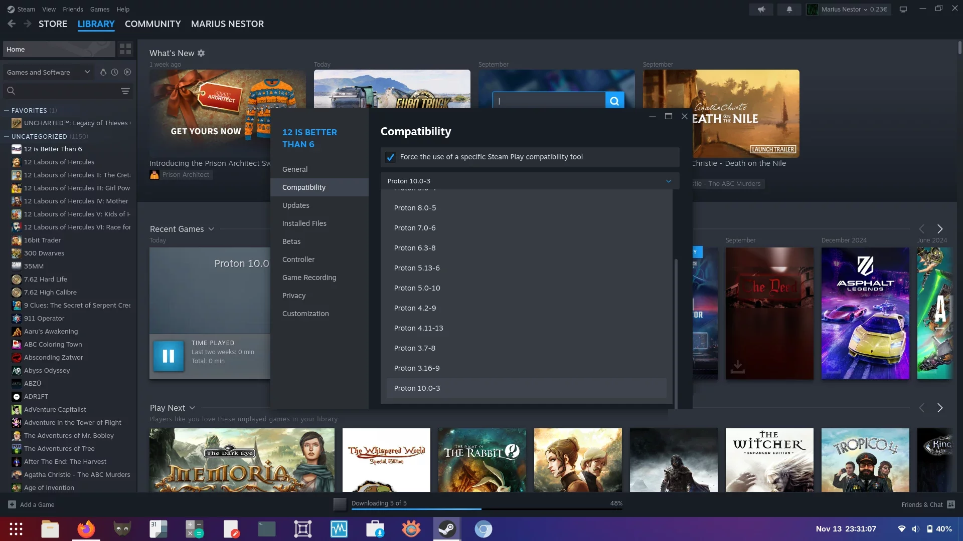 Чтобы активировать новую версию для своей игры в Steam, необходимо зайти в ее свойства, перейти в раздел «Совместимость» и в выпадающем меню принудительно выбрать Proton 10. После этого система автоматически загрузит необходимые файлы.