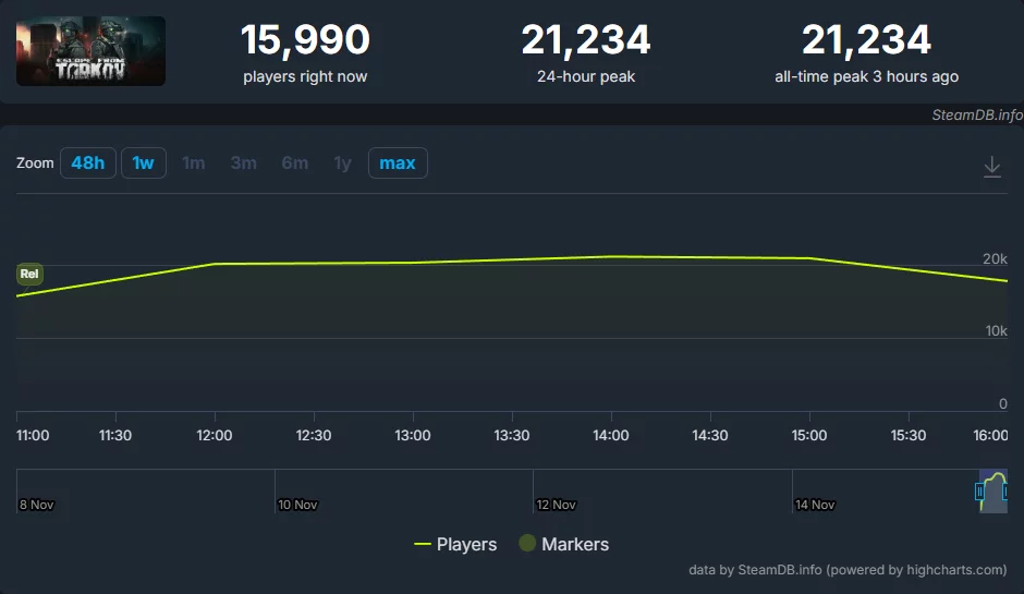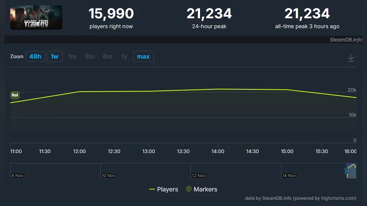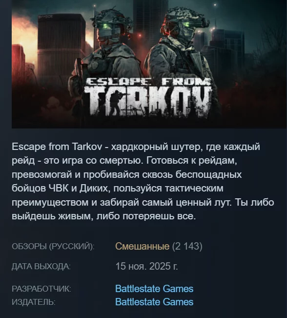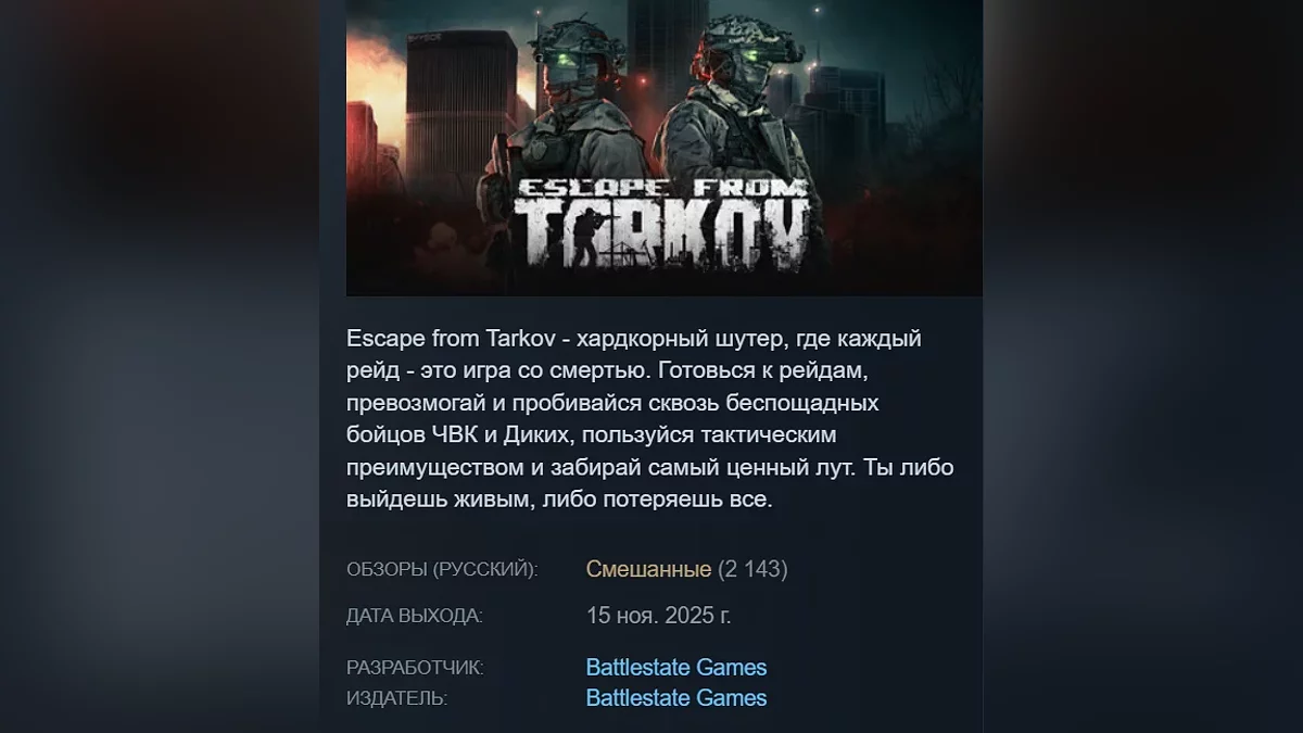 Escape from Tarkov получила всего 40% рейтинга в сервисе Steam (согласно сайту SteamDB). В отзывах игроки массово жалуются, что не могут подключиться к серверам. Что касается пикового онлайна, то он оказался невелик — чуть больше 21 тысячи человек. На момент публикации новости этот показатель опустился до 16 тысяч. Для сравнения, extraction-шутер ARC Raiders собрал 462 тысячи человек в пике онлайна, Escape from Duckov — 303 тысячи, а Arena Breakout: Infinite — 66 тысяч.