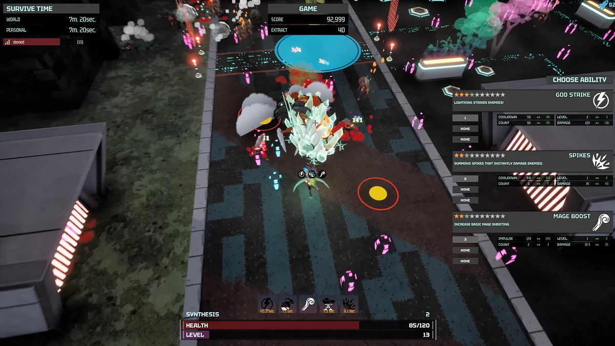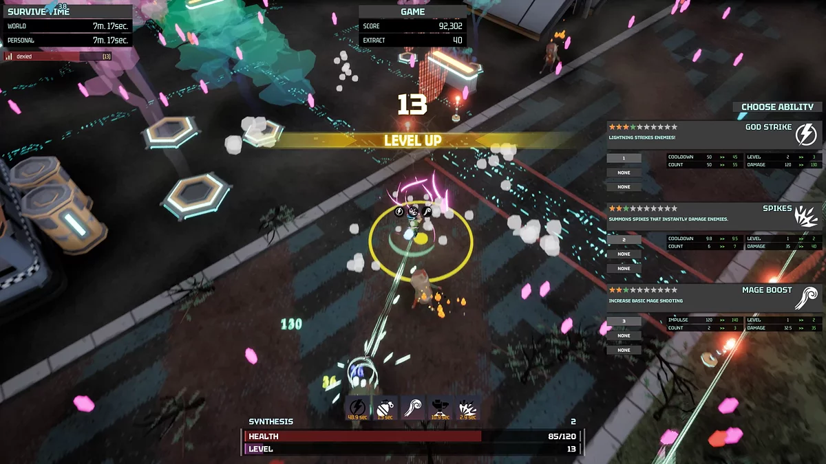 - Система способностей — изначально у вас 4 слота способностей, но затем можно будет увеличить их количество. Убивая врагов и собирая пикапы, которые выпадают с них, вы будете повышать уровень, а каждый уровень вам предоставят выбор из 3 способностей, где выбрать можно только одну. Выбрать можно как мышкой, так и нажатием кнопки.