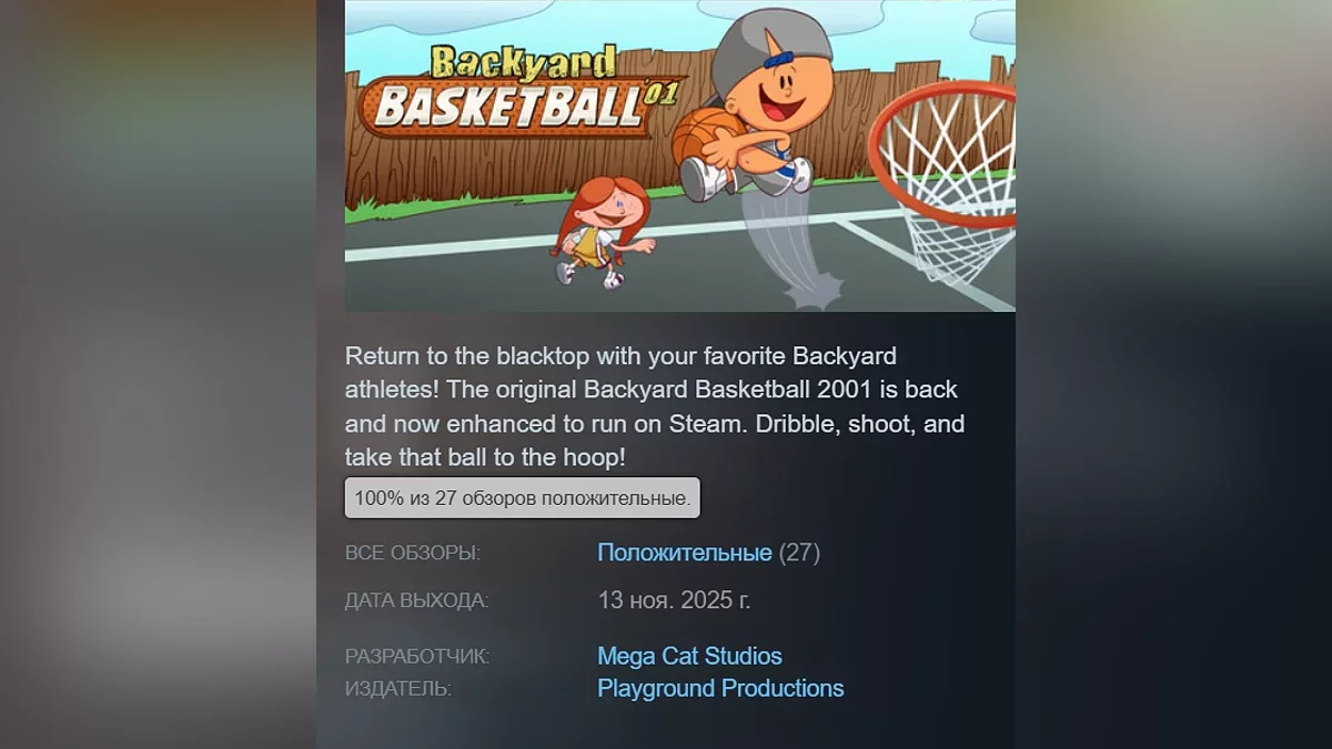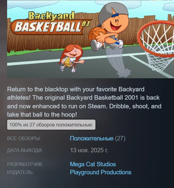 Backyard Basketball '01 — аркадный баскетбольный симулятор 2001 года с 30 персонажами и 9 площадками. В качестве спортсменов выступают дети. В игре нет строгих правил — основной упор сделан на веселье. Проект получил 100% положительных отзывов. Страница в Steam.