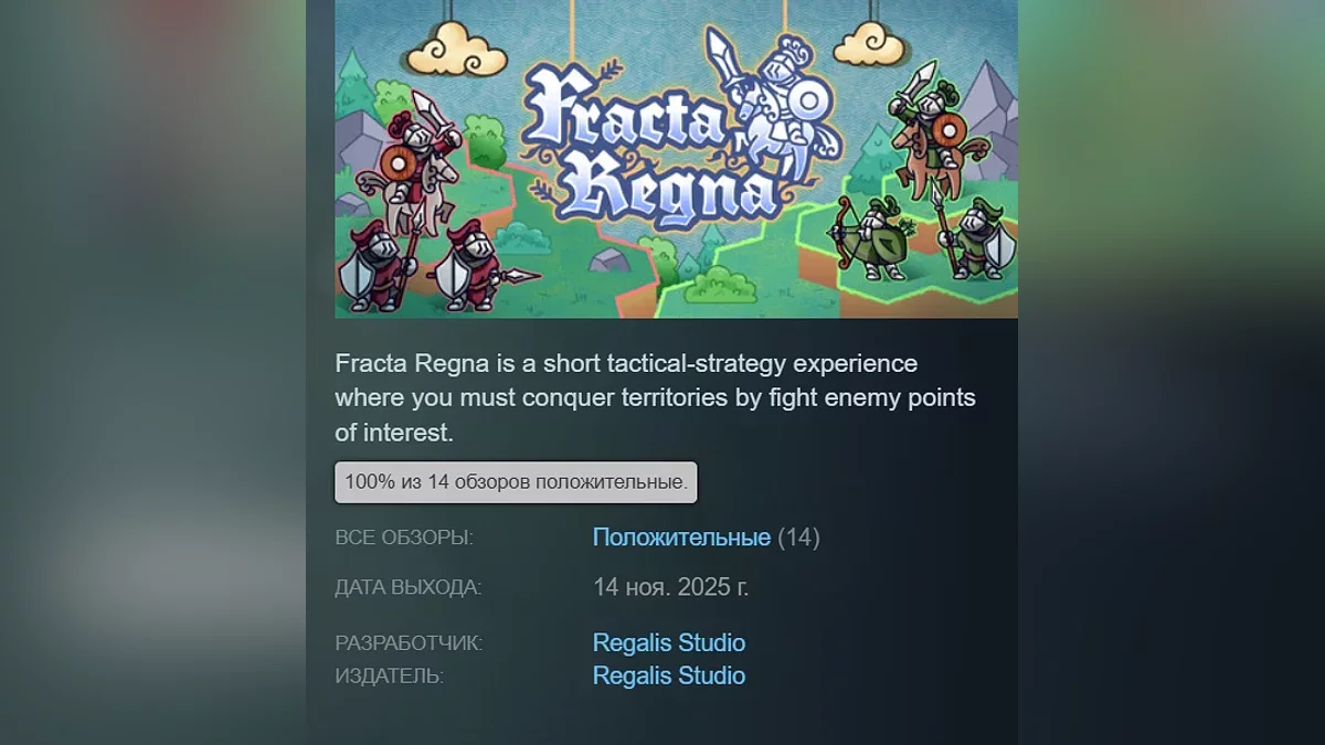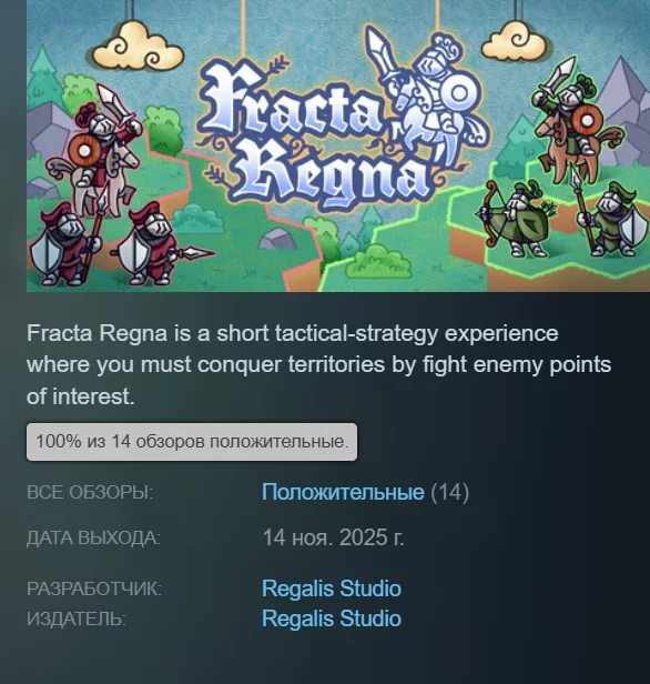 Fracta Regna — простенькая стратегия, где игроки должны завоёвывать территории, сражаясь с вражескими армиями и захватывая их крепости. Получила 100% рейтинга. Страница в Steam.