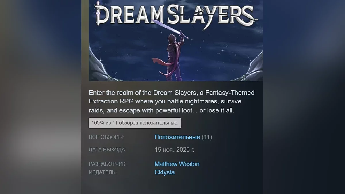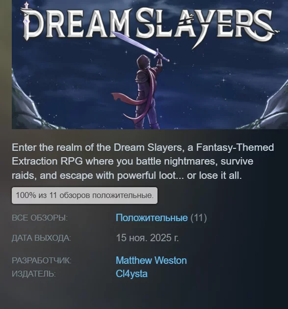 Dream Slayers — фэнтезийная extraction-RPG, где нужно отправляться в рейды, искать редкие реликвии, улучшать снаряжение и сражаться с монстрами. Получила 100% рейтинга. Страница в Steam.