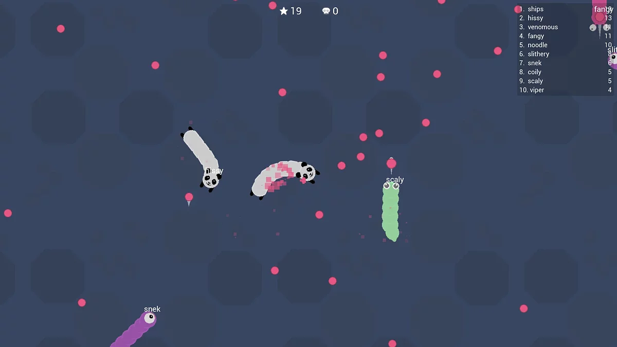 Hiss & Hunt — многопользовательская «Змейка» с пиксельной графикой, выпущенная в раннем доступе. В текущей версии есть одна карта, мультиплеер и несколько скинов. В будущем игра получит новые облики, режимы, карты и, возможно, механики. Страница в Steam.