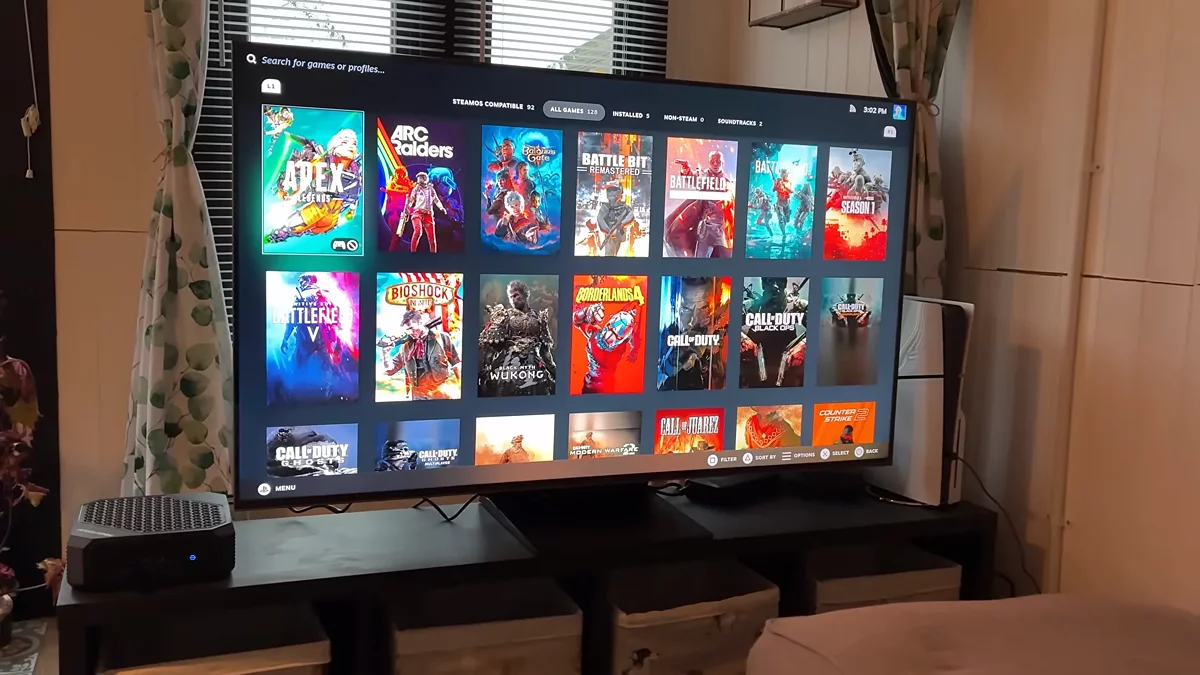 Хотя у официальной Steam Machine компоненты будут новее, по итоговой мощности системы окажутся примерно на одном уровне. Для полного погружения в концепцию на устройство была установлена SteamOS от Valve. Операционная система работает на мини-компьютере плавно и стабильно. Пользователь может работать в стандартном режиме Big Picture или при необходимости переключиться на полноценный десктоп для установки других программ и лаунчеров.