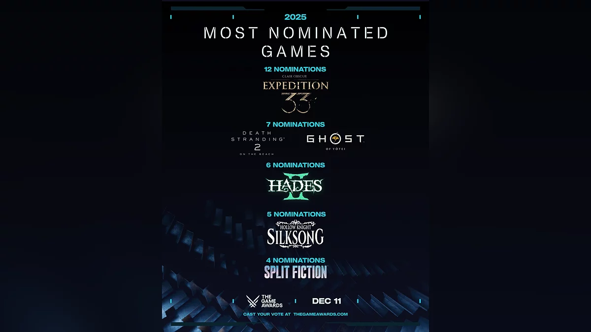 Ведущий шоу Джефф Кейли (Geoff Keighley) опубликовал статистику: у Hades 2 — шесть номинаций, Hollow Knight: Silksong — пять, Ghost of Yotei и Death Stranding 2 — по семь. А вот Clair Obscur: Expedition 33 побила все рекорды и вышла в лидеры с двенадцатью. Игра представлена во всех ключевых категориях и у неё три номинации на «Лучшую актерскую игру».
