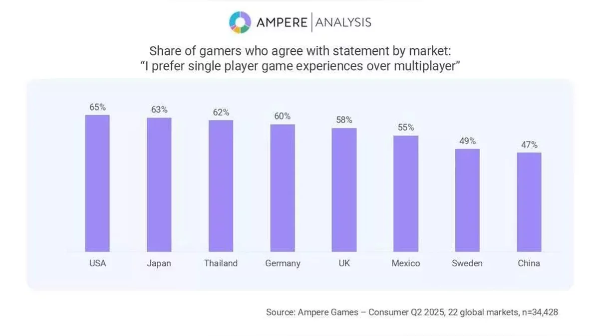 Исследование, охватившее десятки тысяч человек по всему миру, демонстрирует устойчивую любовь пользователей к одиночным играм. Ярче всего этот тренд заметен в США, где 65% опрошенных предпочитают видеоигры, рассчитанные на одного человека. Аналогичная ситуация сложилась в Японии, Германии и Великобритании, где больше половины игроков голосуют за персональное погружение в виртуальные миры, а не за совместные сессии.