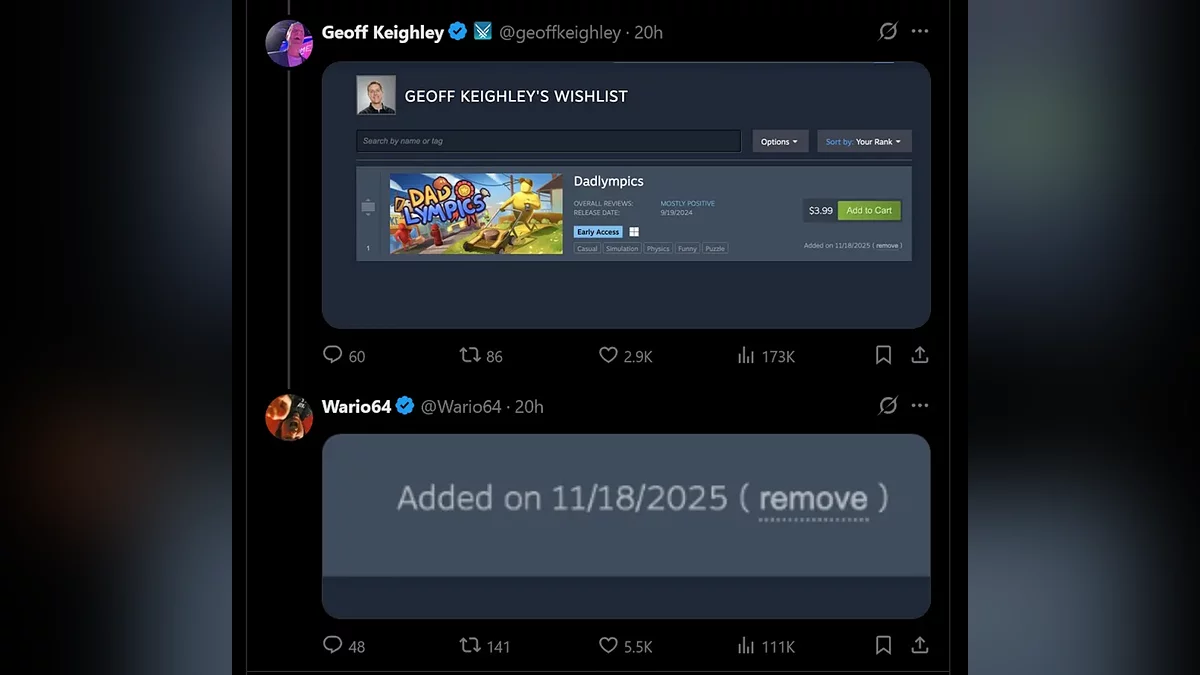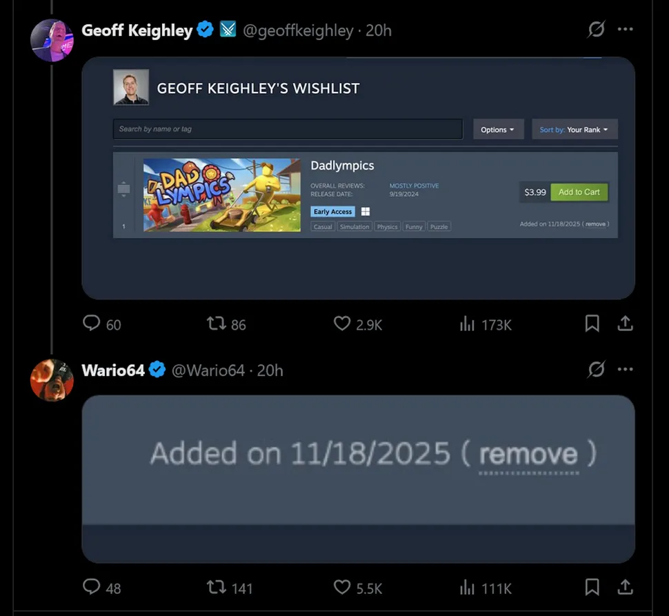 Через день Кейли опубликовал «доказательство»: скриншот, где видно, что единственная добавленная игра — Dadlympics, дурашливая комедия про отцов, швыряющих детей в спортивных соревнованиях с пиковым онлайном 6 человек. Проблема в том, что дата добавления на скрине — 18 ноября 2025 года, уже после начала всей истории.